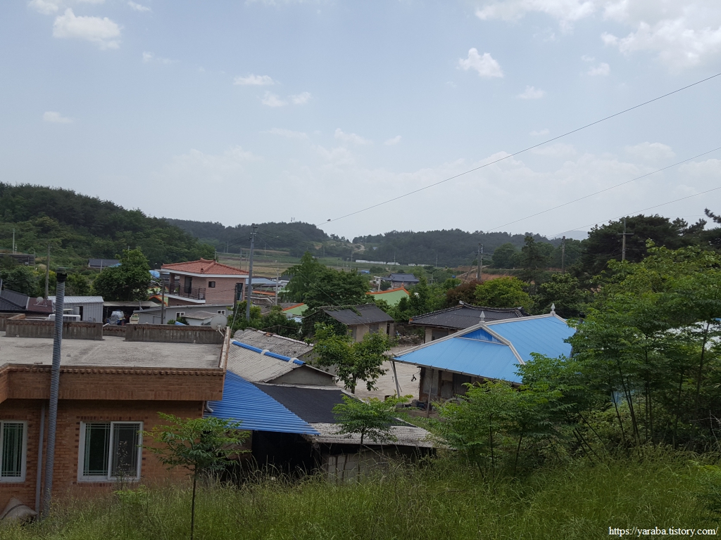 마을 뒷산에 올라서면 산 반대편으로 송림 마을이 내려다 보인다. 산 정상으로는 정자도 설치되어 있다. 길은 산 정상으로 가지 않고 좌측 내리막길로 산을 내려간다.