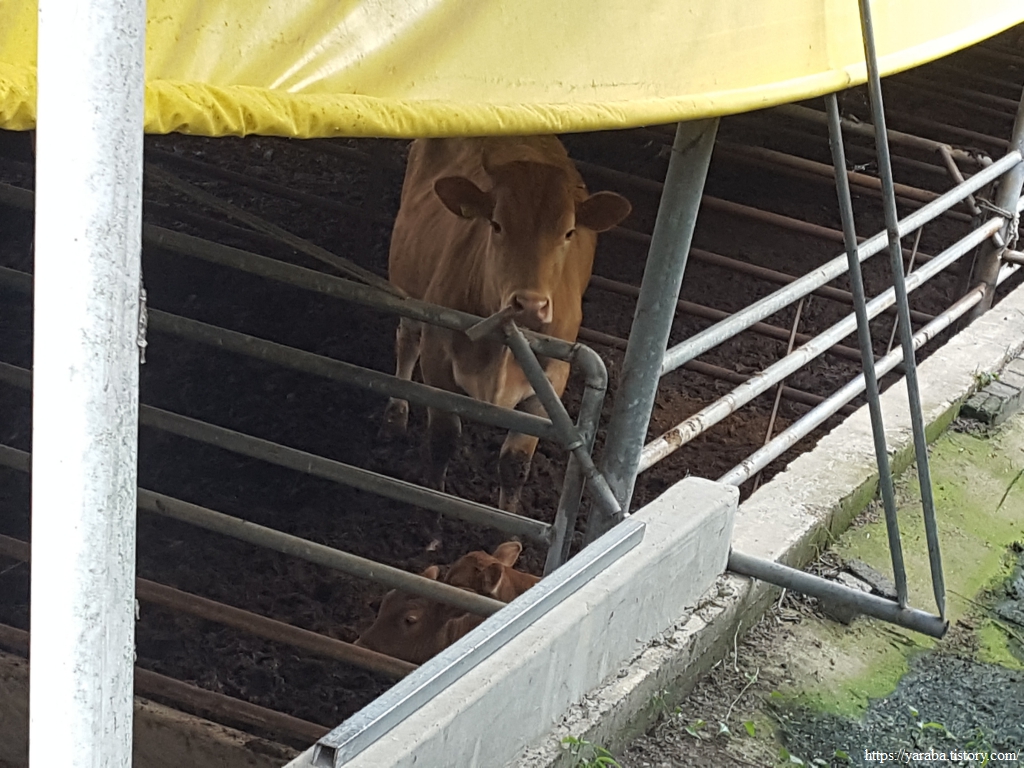 아기 동물들은 언제 보아도 귀엽다. 송아지 두 마리와 함께 있는 어미소가 낯선 우리들을 유심히 지켜보고 있다. 우리는 너희에게 아무런 손도 대지 않을 거야, 애들 잘 키워! 통상 소는 1년에 한 번 번식을 하고 임신을 하면 283일이 임신 기간이라는데 저 어미소는 쌍둥이를 낳은 모양이다.