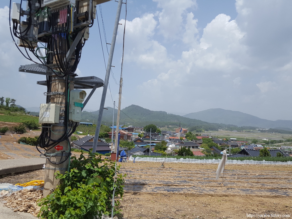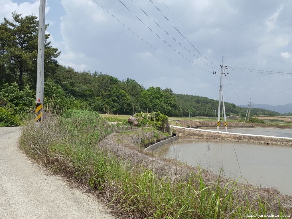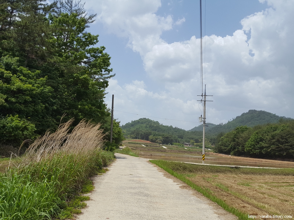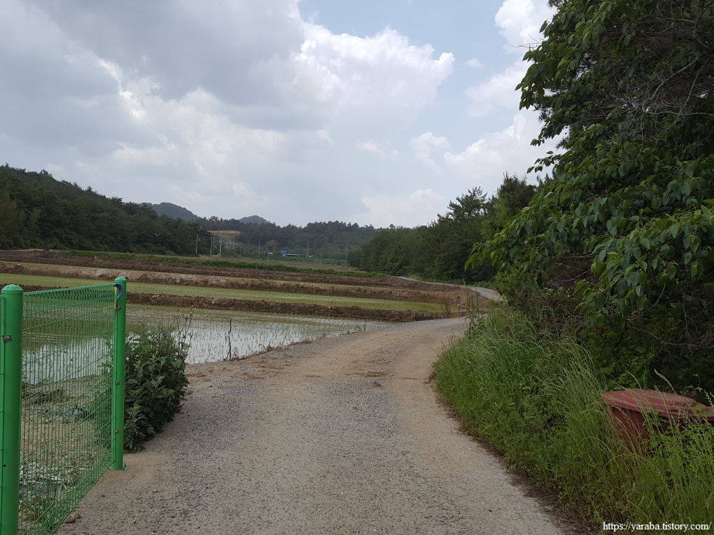 산 아랫자락을 따라 이어지는 농로는 모내기 준비가 한창인 안남리 들판을 하나하나 지나간다. 계속 좌측으로 돌아 산 아랫자락을 따라간다.