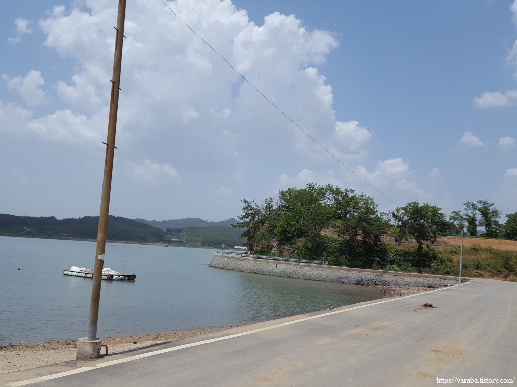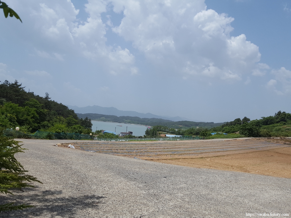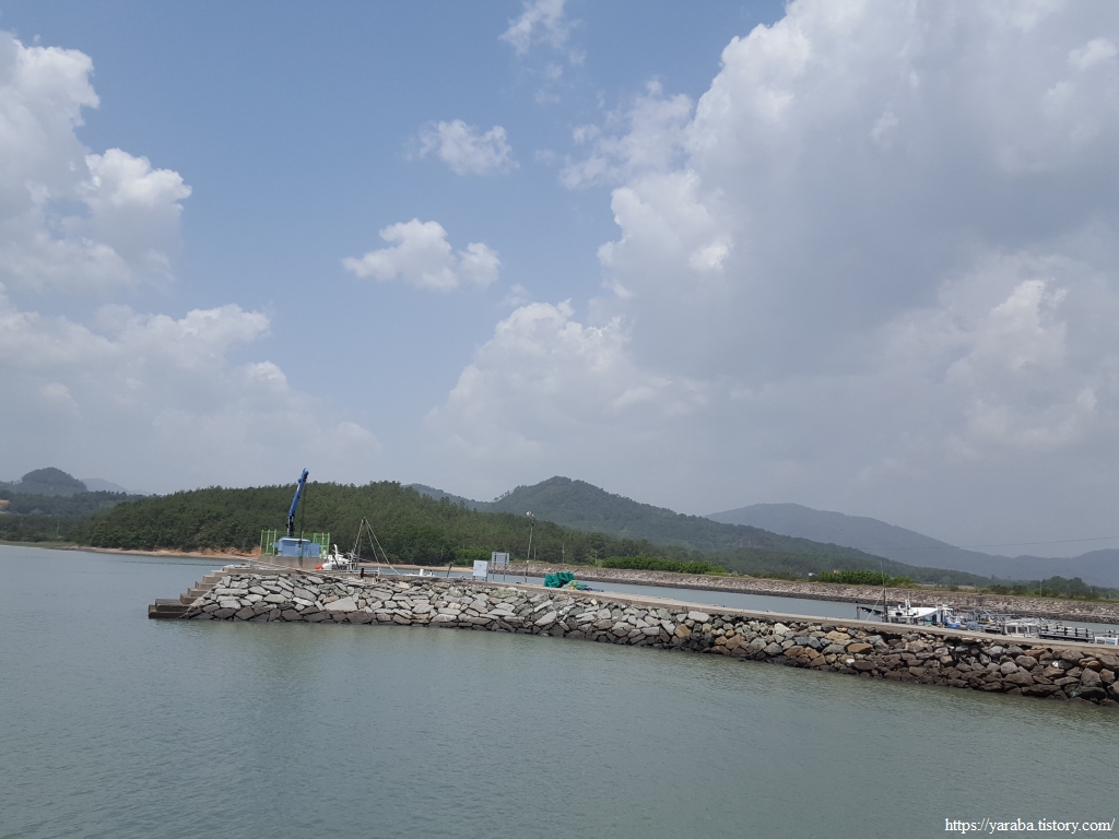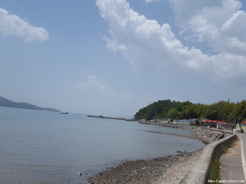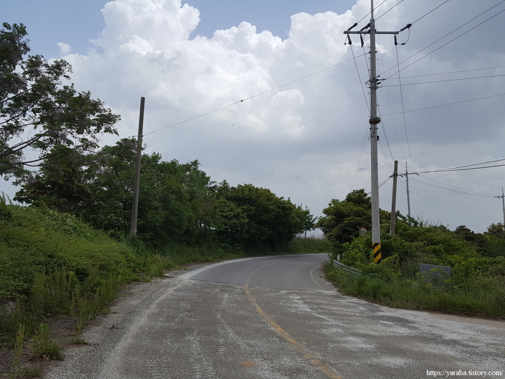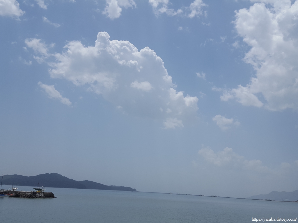 서남쪽을 보면 득량만 바다가 끝없이 이어진다. 우측으로는 송림 포구 너머로 우리가 지나가야 할 송림 방조제도 보인다. 뭉게구름이 몰려오는 것이 소나기라도 뿌릴 것 같지만 해안길은 여전히 그늘하나 없다.