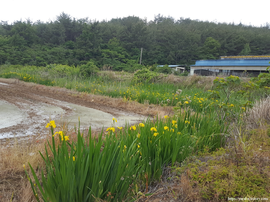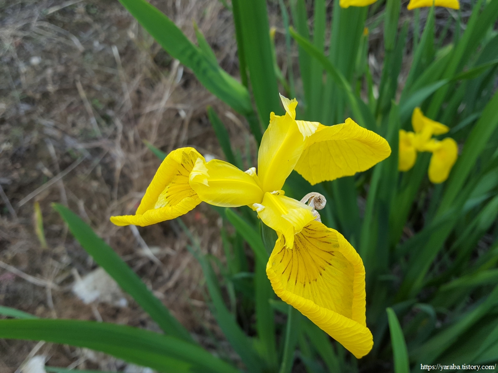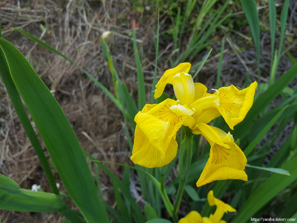 북성산 아랫자락을 돌아 계곡을 따라 신기 마을로 올라가는 길, 한 농가 앞 논 주위로 노란 꽃들이 줄지어 피어있다. 멀리서 보았을 때는 우리 집 화단에서 찬밥 신세인 수선화가 아닌가 싶었다. 그런데, 가까이 가서 보니 수선화가 아니라 연못이나 습지에서 자라는 노랑꽃창포였다. 유럽 원산의 여러해살이풀이다. 논 주위 수로에 자리를 잡은 모양이다. 이 또한 귀화 식물로 그림에서 보다시피 다른 식물이 자리하지 못할 정도로 퍼지기 때문에 생태 교란종으로 분류하고 있다고 한다.