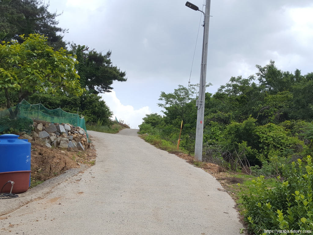 길은 농로 갈림길에서 좌측 고갯길을 오른다. 앉을 만한 공간이 보여서 배낭을 내려놓고 잠시 쉬어간다.