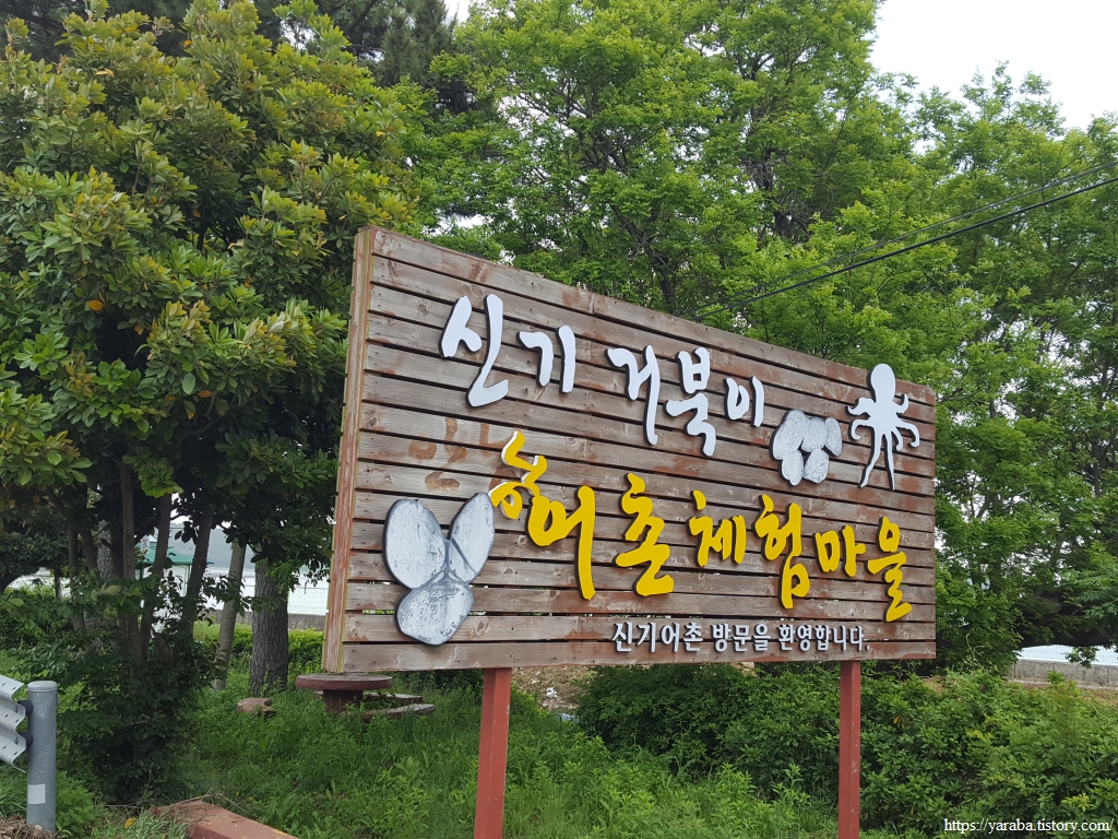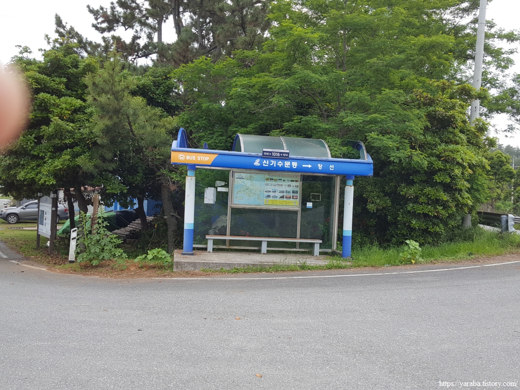 다양한 체험 활동을 할 수 있다는 신기 거북이 어촌 체험마을 바로 앞이 75코스의 종점인 신기 수문동 버스 정류장이다. 이곳에 도착한 시간이 1시 37분. 장선포에 1시 40분에 도착한다는 버스는 이미 이곳을 지나간 모양이다. 다음 버스 시간이 16:00이니 두 시간 넘게 이곳에 앉아 있을 수는 없었다. 76코스의 장선포까지 가면 버스 후보가 조금 더 있으니 계획하지는 않았지만 76코스를 이어서 걷기로 했다.