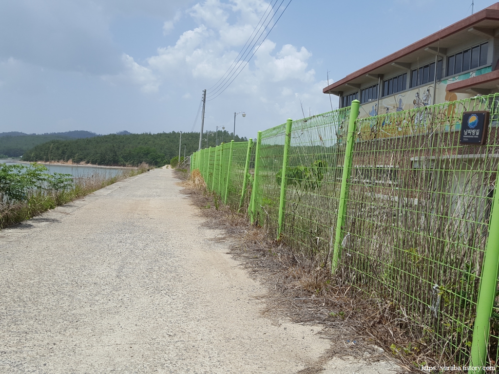 산 아랫자락의 농로를 걸어 해변으로 나오면 둑방길에 뜬금없이 자갈 지압길이 등장한다. 길 좌측으로 신기 마을의 갯벌 체험장이 있는데 체험장부터 방조제까지 지압길을 만든 모양이다. 우리는 우측 신기 방조제의 도로를 따라서 신기 수문동으로 이동한다.