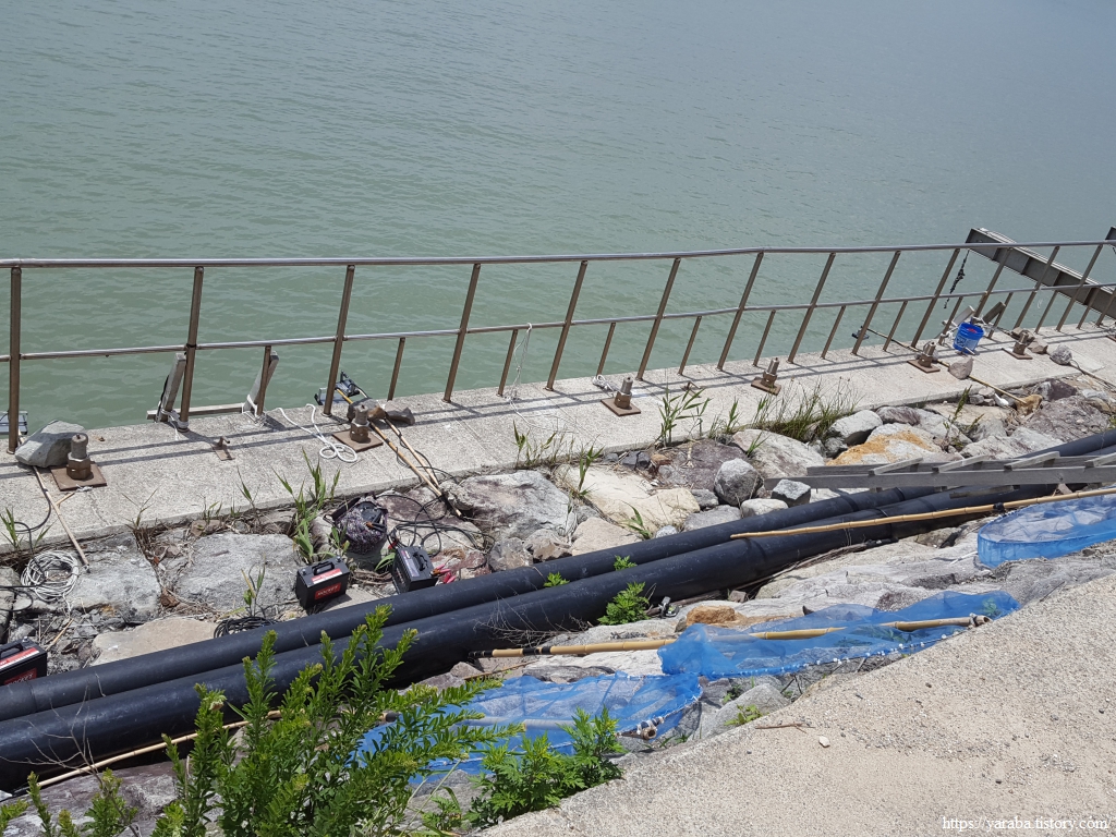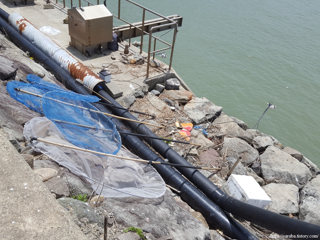 방조제를 지나는데 바다 쪽으로 특이한 장비들이 줄지어 늘어서 있다. 실뱀장어를 잡는 도구들이다. 연어는 바다에 살다가 알을 낳기 위해서 하천으로 돌아오지만, 장어는 반대로 민물에 살다가 알을 낳기 위해서 바다로 간다고 한다. 그리고 알에서 부화한 뱀장어들이 다시 하천으로 돌아오는데 방조제 둑에 있던 도구들은 히라시라고도 부르는 실뱀장어를 잡는 도구들이었다. 칠흑 같은 밤에 배터리에 연결한 조명으로 집어등을 밝히면 실뱀장어들이 몰려드는데 이때 뜰채를 이용해서 잡는 방식이다. 대부분 양식장에 팔리는데 워낙 금값이라 쌀 때는 마리당 2백 원에서 비싸면 6백 원에도 나간다고 한다. 1Kg에 2~3백만 원이니 진짜 금값 맞다.