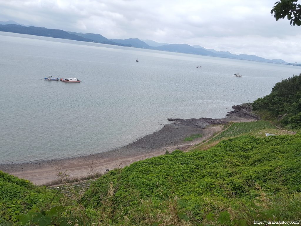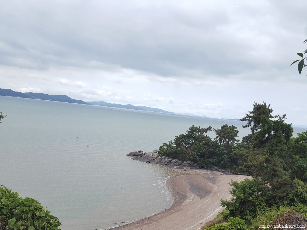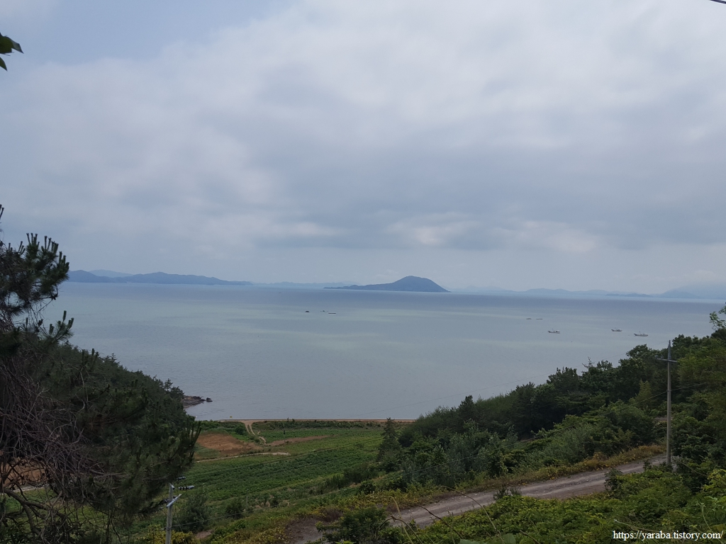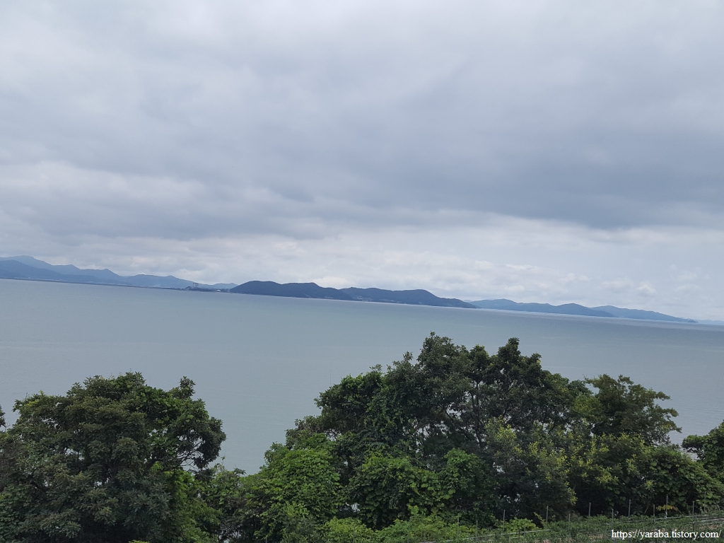 날씨가 조금 흐린 까닭에 바닷물의 색깔이 다르게 보여서 인지, 아니면 높은 곳에서 바라보는 해안 풍경이 특이해서 그런지, 득량만 바다가 이국적인 분위기를 풍긴다.