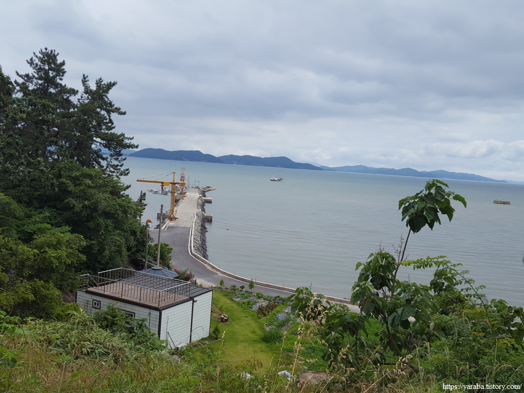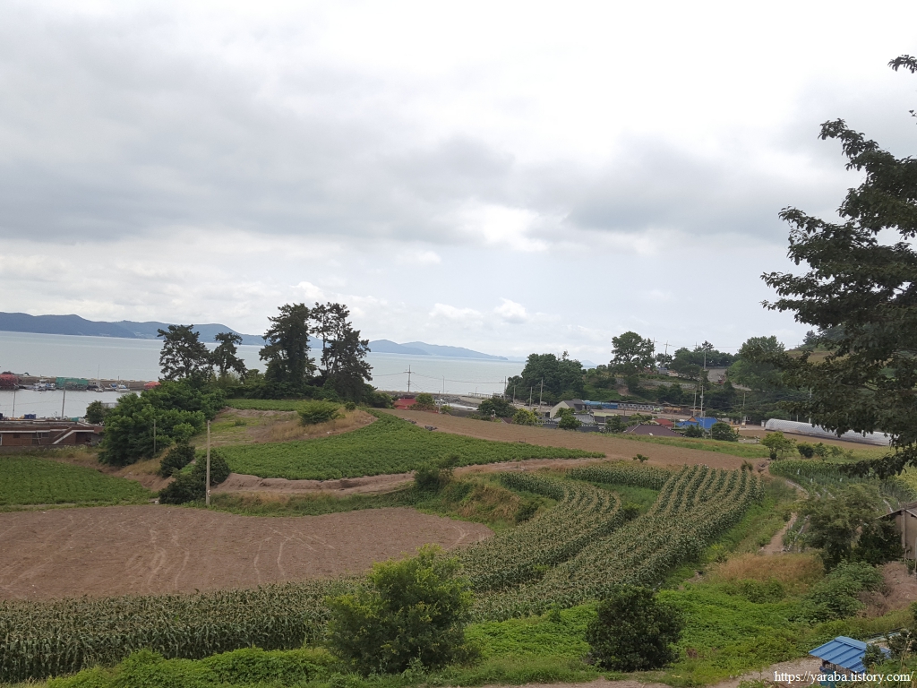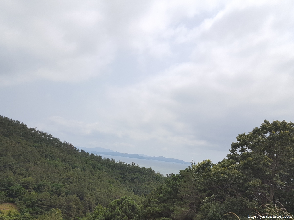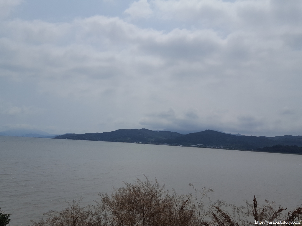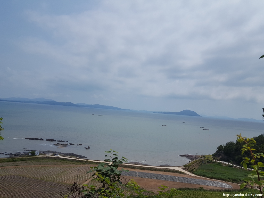 날씨가 조금 흐린 까닭에 바닷물의 색깔이 다르게 보여서 인지, 아니면 높은 곳에서 바라보는 해안 풍경이 특이해서 그런지, 득량만 바다가 이국적인 분위기를 풍긴다.