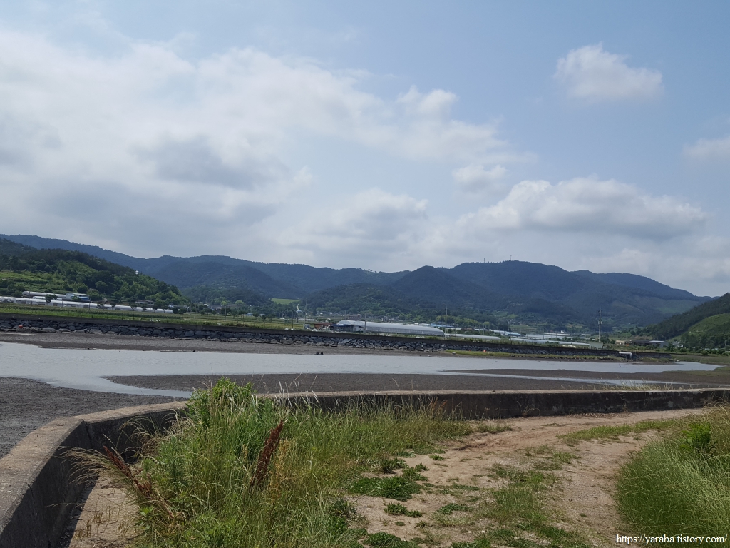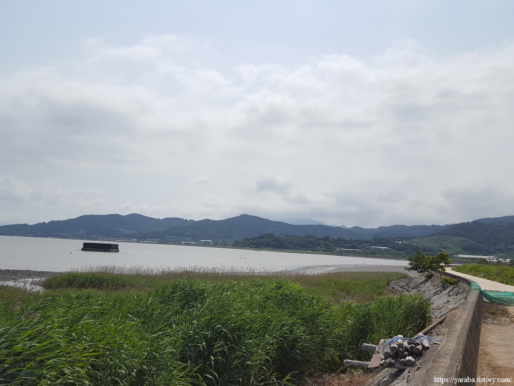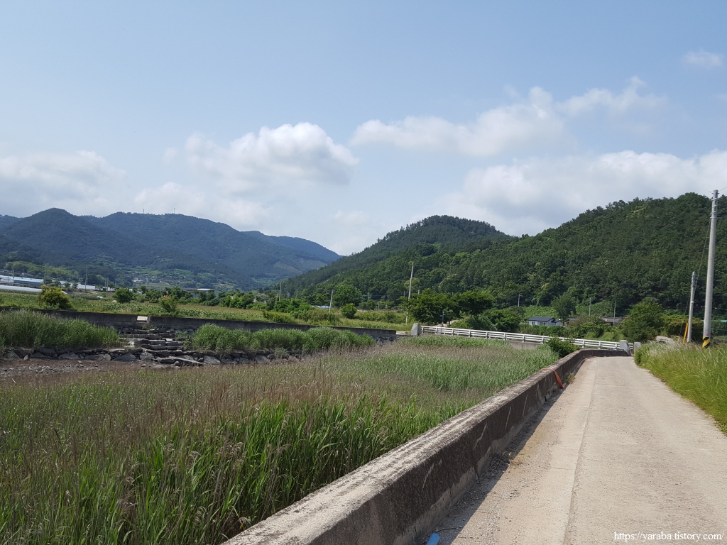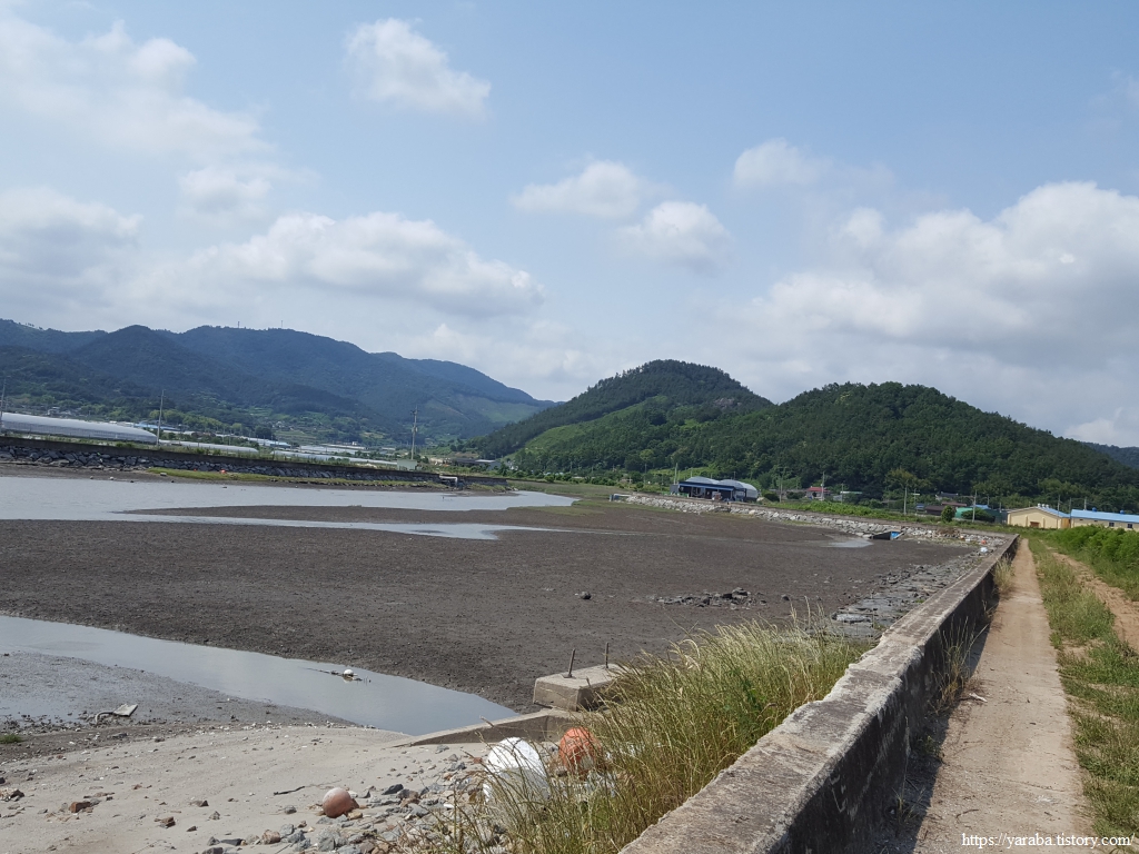 화죽천 하구를 건너는 다리가 있다면 바로 건너서 화죽리 해안길로 넘어가면 되겠지만 그런 다리는 없다. 화죽천 하구를 빙 둘러가는 둑방길을 걸어야 한다.