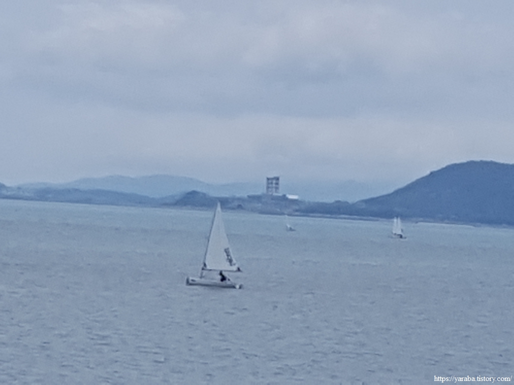 득량만 앞바다에는 딩기 요트들이 바람을 타고 있다. 딩기(Dinghy) 요트는 엔진도 선실도 없이 작은 돛으로 항해하는 요트로 1인용에서 3인용까지 있다. 방향을 보아서는 아마도 보성 비봉 마리나로 향하는 모양이다.