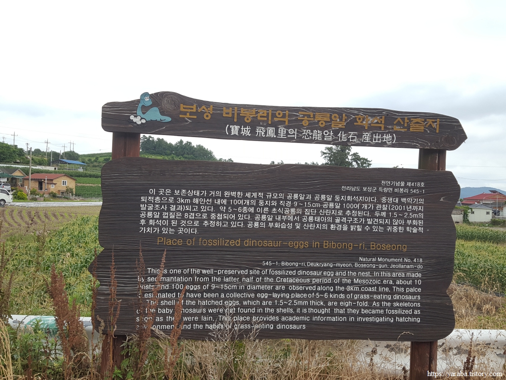 큰길에서 좌회전하여 포구 쪽으로 내려가면 득량만바다낚시공원과 비봉공룡알화석지를 만날 수 있는데 화석지는 보존 상태가 거의 완벽한 세계적인 공룡알 화석지로 3Km의 해안에 걸쳐 직경 9~15Cm의 공룡알 백여 개가 발견되었다고 한다. 현존하는 가장 큰 알인 타조알의 직경이 13~15cm라고 하니 대충 가늠할 만하다.