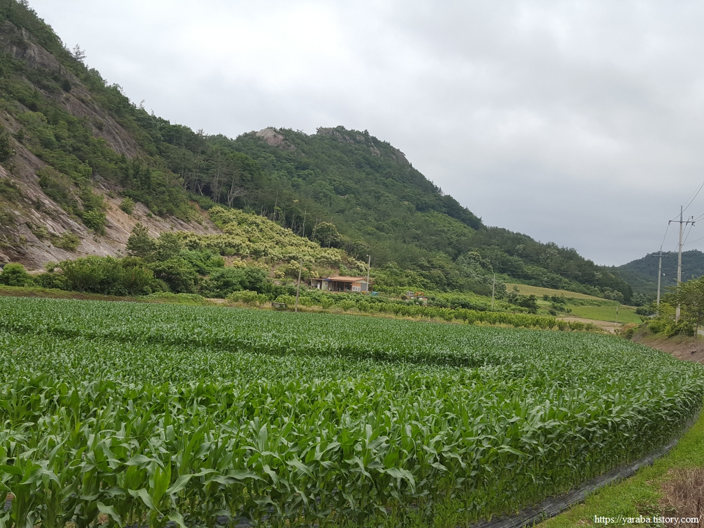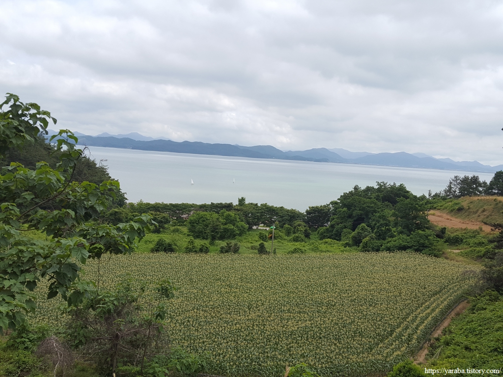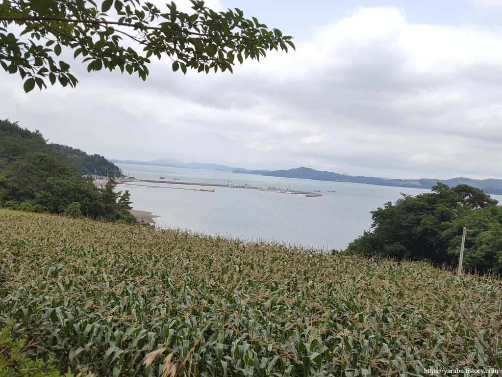 공룡로 도로가 산 중턱을 가르다 보니 득량만 바다를 제대로 감상하며 지나간다. 산 아래로 자리한 광활한 옥수수밭도 하얀 돛을 올리고 바다를 가르는 딩기 요토도 인상적인 경관을 선사한다.