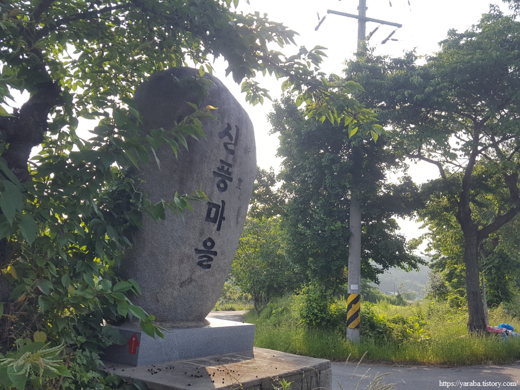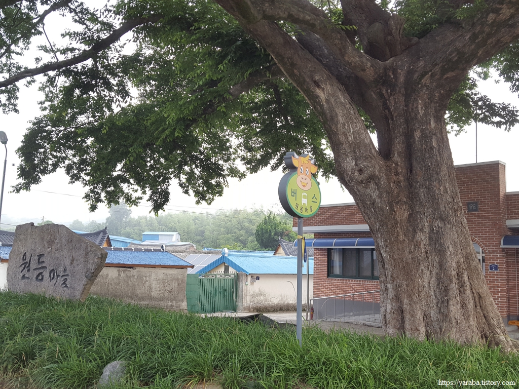 장흥 시내에서 하룻밤 묵고 용산면 덕암리 원등 마을을 돌아온 우리는 마을 회관 앞의 커다란 나무와 인사하며 하루를 시작한다. 어제 장흥으로 들어오면서 소머리 버스 정류장 표식을 보았지만 아침에 다시 보니 빙그레 미소가 지어진다.