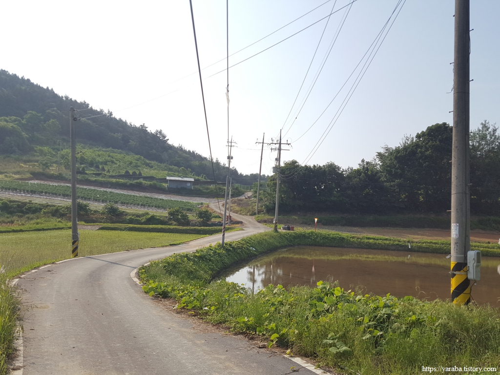 둑방길을 걸어 내려온 우리는 소형곡산 앞에서 큰길 방향으로 농로를 걷는다. 그런데, 아뿔싸 논에서 내려온 물이 웅덩이를 이루고 있었다. 원래의 경로대로 갔으면 거치지 않아도 될 길인데 풀밭 둑방으로 겨우 우회했다. 매년 이 구간에서 많은 사람들이 곤란을 겪었을 테니 경로를 농로를 걷도록 바꾼 것이 아닌가 싶다.