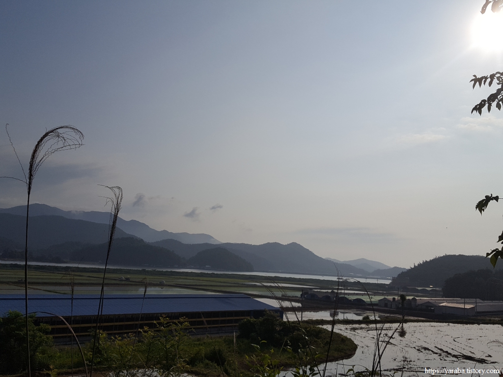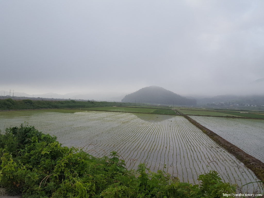 농어두 마을의 논 바로 뒤로는 농어두제 저수지가 자리하고 있고 그 너머로 남상천 둑방길도 눈에 들어온다. 산자락에 남아 있는 낮은 구름들은 풍경을 신비롭게 만든다. 이젤 놓고 앉아서 스케치라도 하고 싶은 풍경이다.
