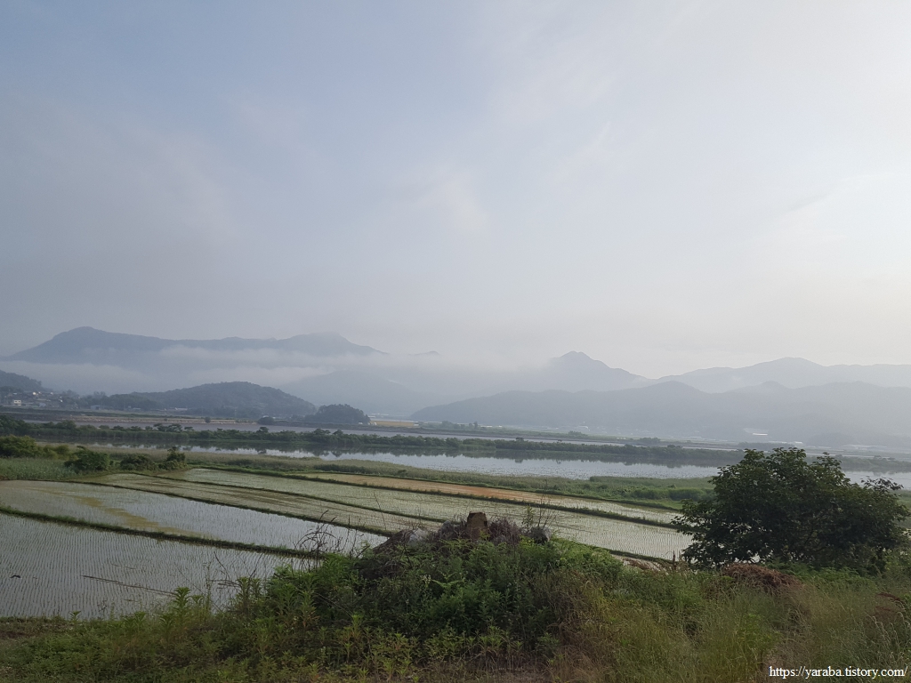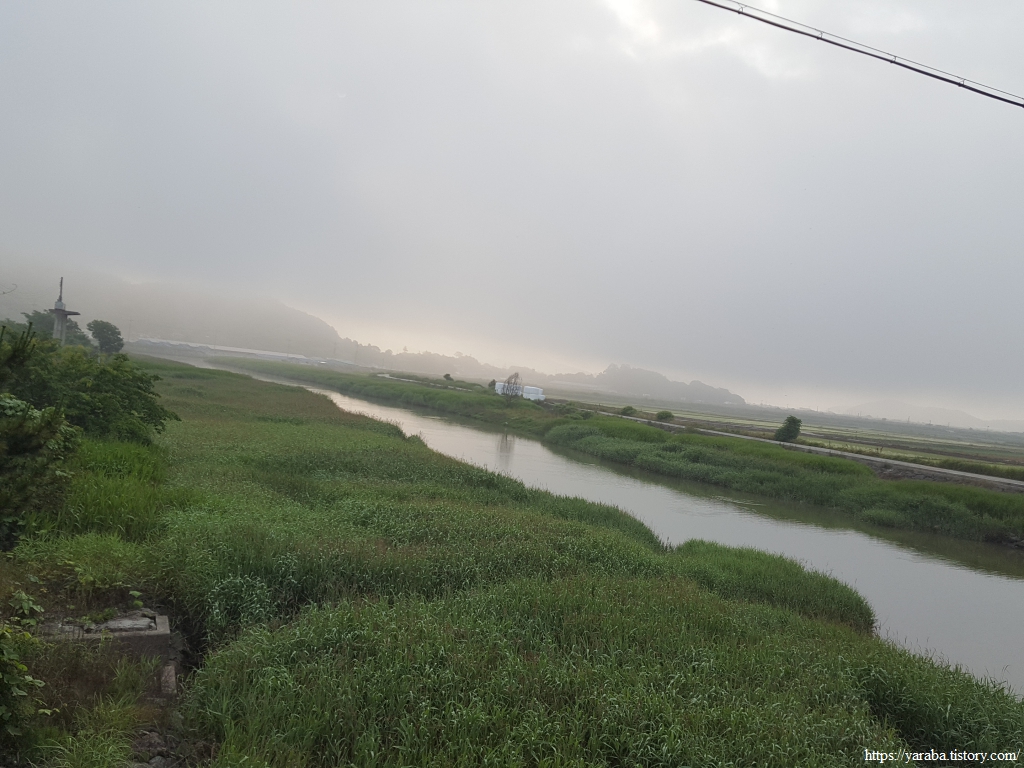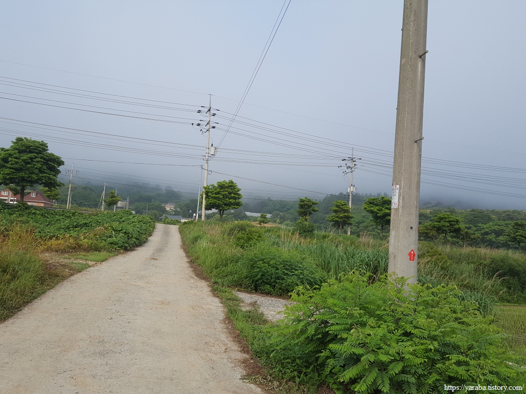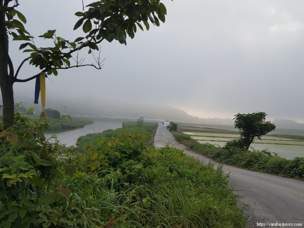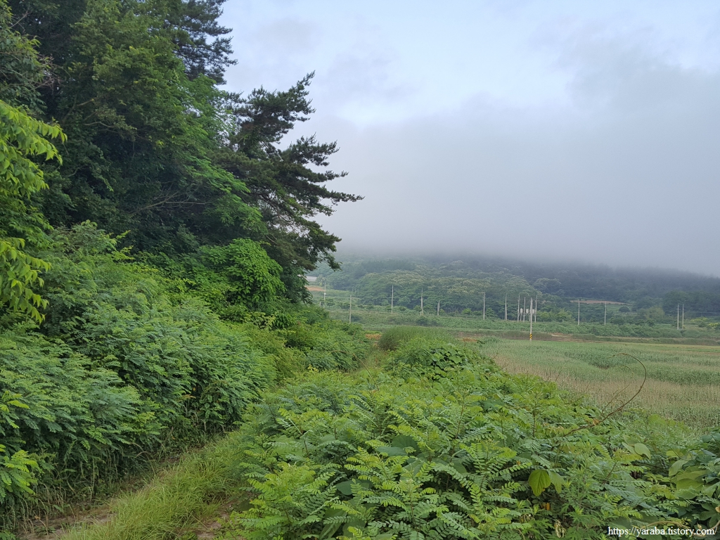 남상천 하천변은 풀이 가득하고 물안개가 자욱하다. 덕암교 다리를 지나면 바로 좌회전하여 남상천 둑방길을 따라가다가 우측 농로를 가로지른다.