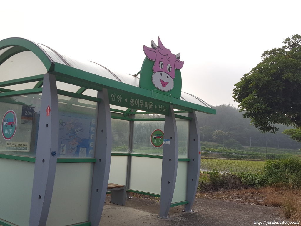 농어두 마을을 지나 길을 이어간다. 이제는 적응할 때도 되었는데 버스 정류장의 소머리를 보면 여전히 웃음이 나온다. 마을 앞에서 농어가 많이 잡혔다고 농어리라 했다가 마을 모양이 소머리를 닮았다고 농우두라 했다가 농어두로 바뀌었다고 한다. 어찌 되었든 소머리와 연관이 있는 동네다.