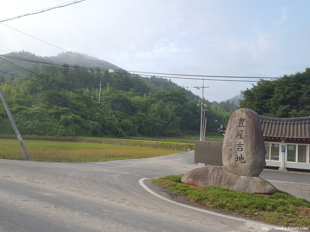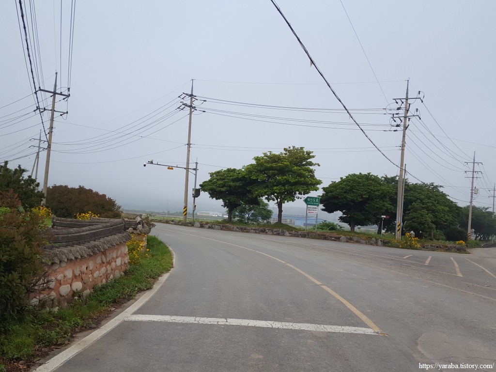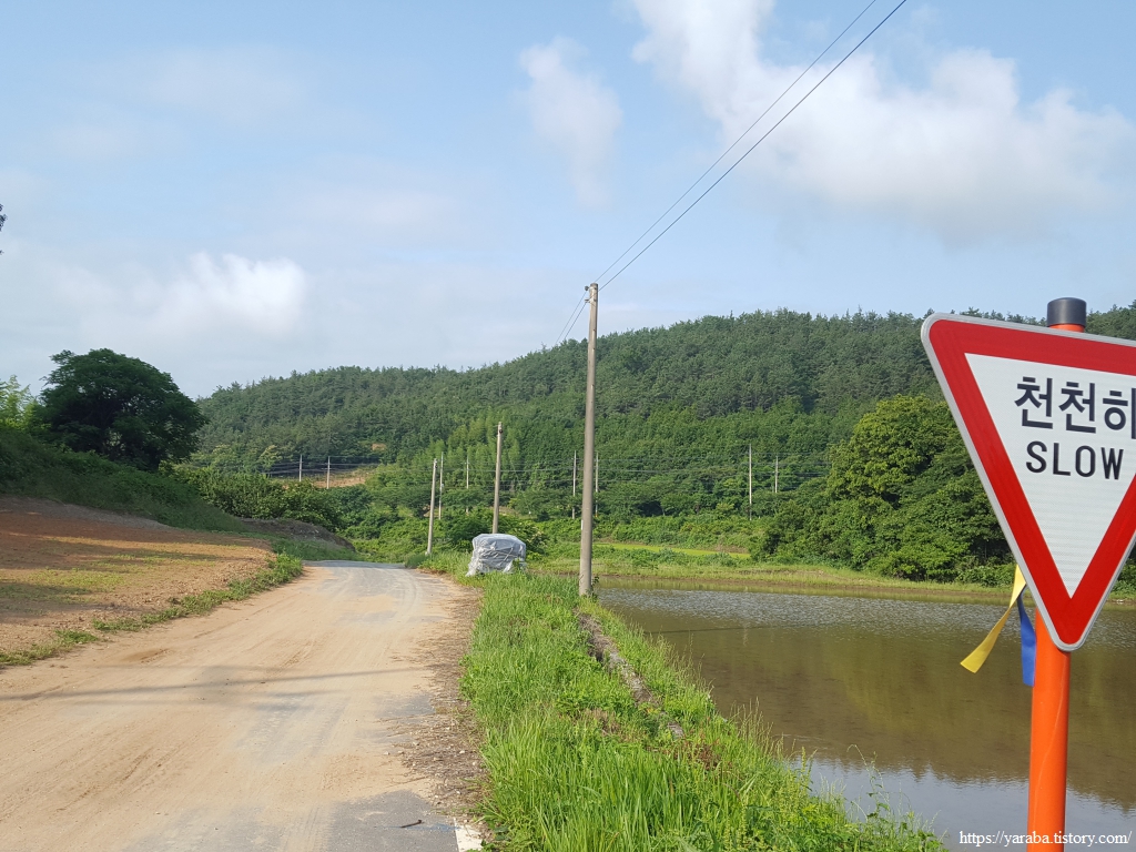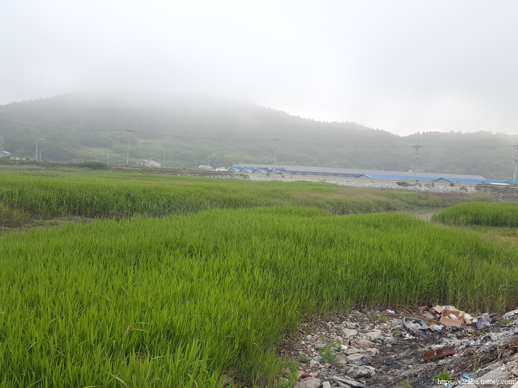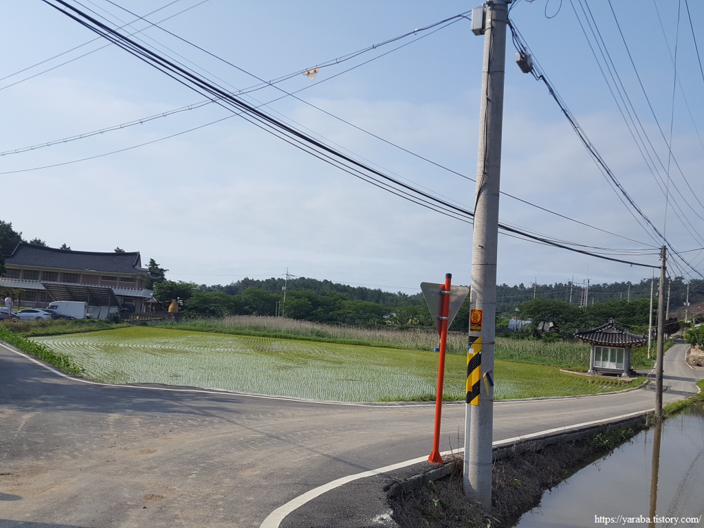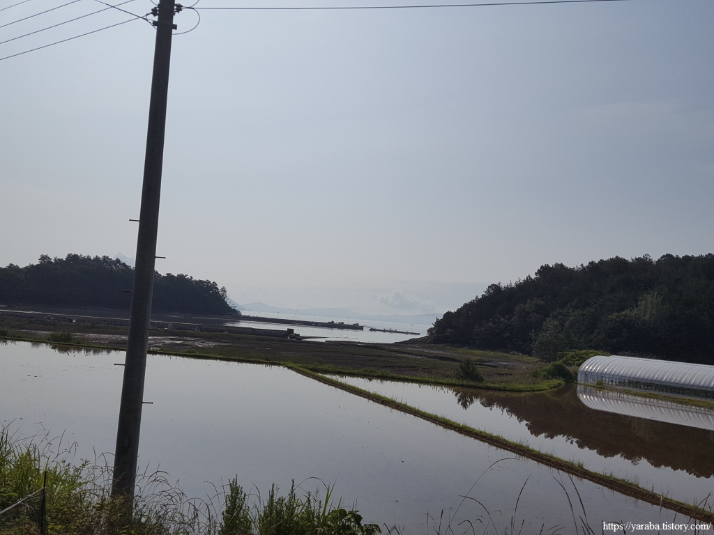 어느덧 구름과 안개는 사라지고 강렬한 태양이 작렬하기 시작했다. 이 동네에는 6월 중순에 아직 모내기를 하지 않은 곳도 있다. 아마도 소먹이풀과 벼를 이모작 하는 논이 아닌가 싶다. 멀리 둑방 너머로 어제 걸었던 사촌, 해창간 방조제도 시야에 들어온다. 신풍 마을이라는 이름은 풍길리 간석지 인근에 새로 생긴 마을이라고 붙은 이름이라고 한다.