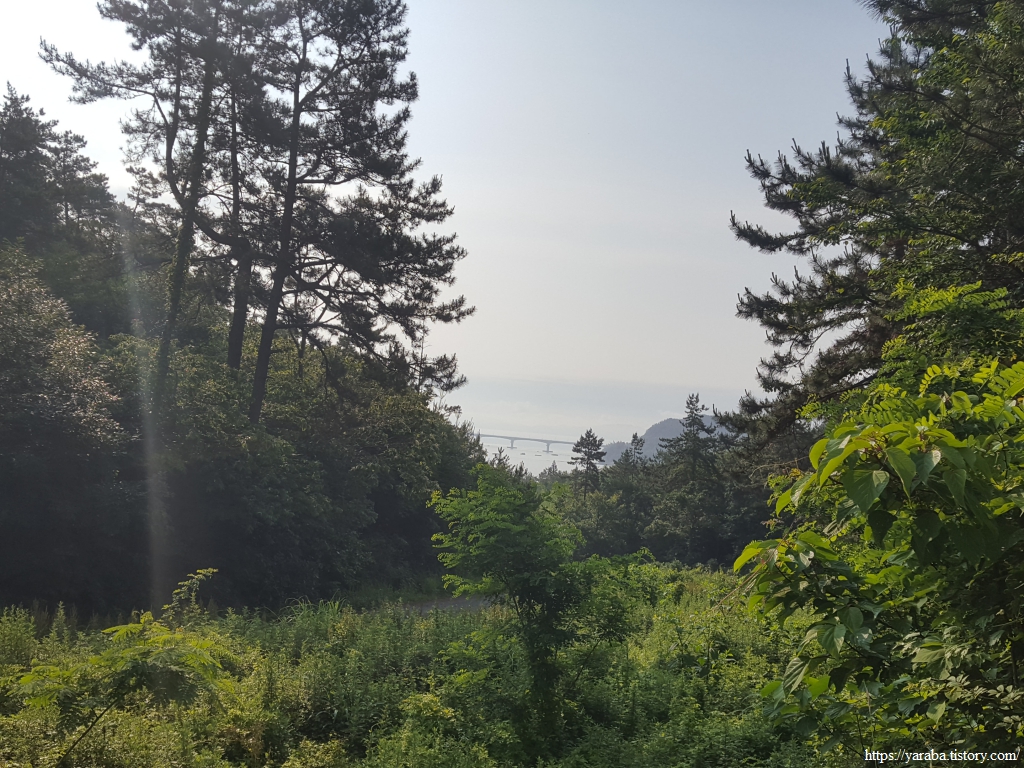 고개를 넘어가는 길에서는 계곡 아래로 멀리 장재도와 용산면 상발리를 잇는 정남진 대교도 보인다.