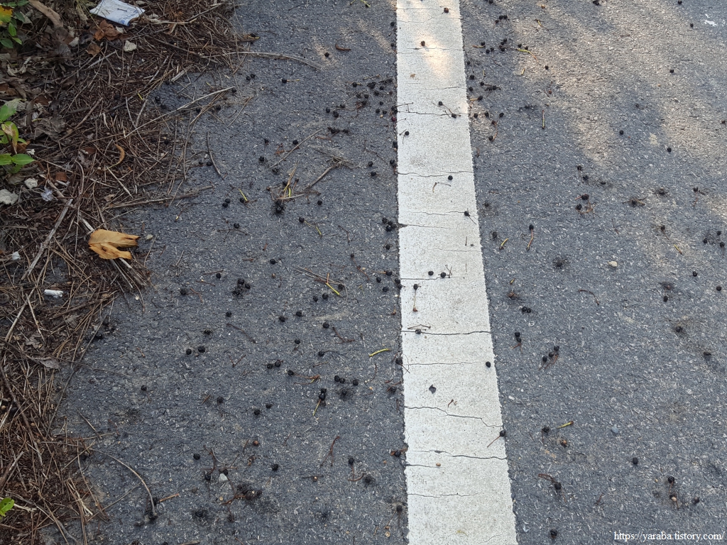벚나무가 양쪽으로 늘어선 접정남포로 도로 바닥은 버찌의 계절인 것을 증명이라도 하듯 익어서 떨어진 버찌가 도로를 물들이고 있다.