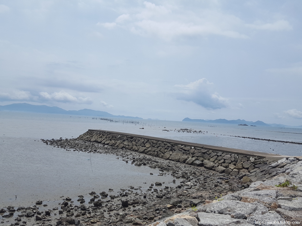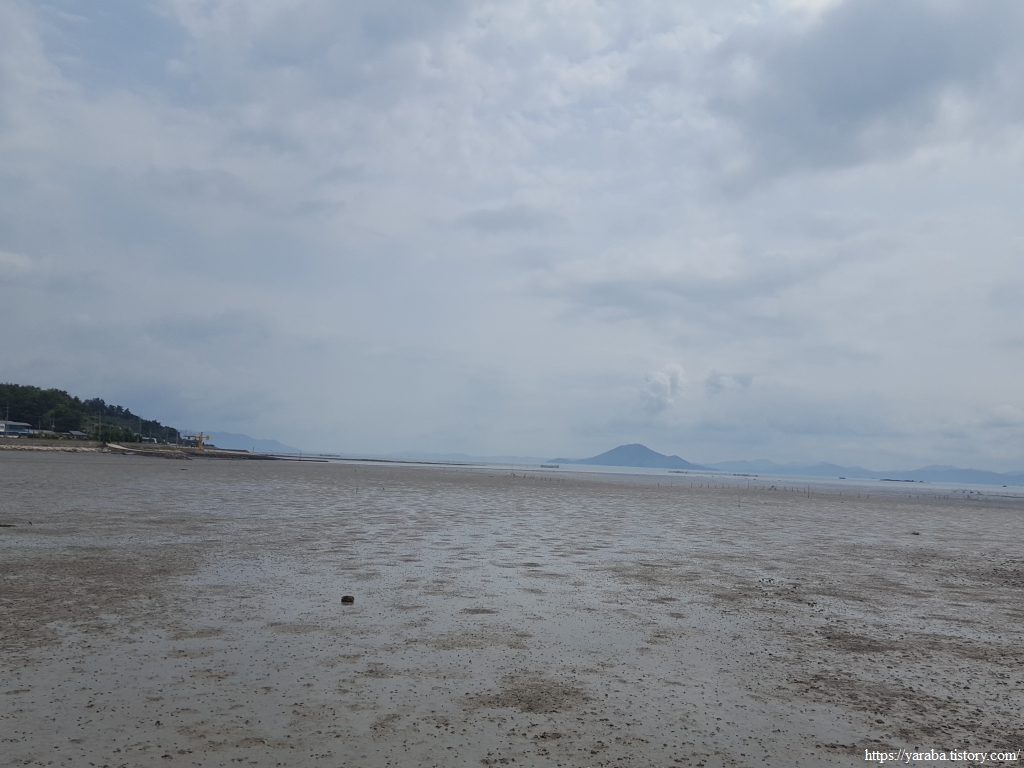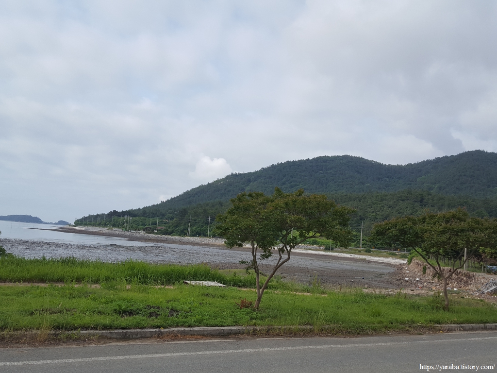 산 아랫자락으로 이어가는 정남진 해안로에서 동북쪽을 보면 갯벌 너머로 득량도가 보인다. 득량도를 보는 마지막 지점이지 않을까 싶다.