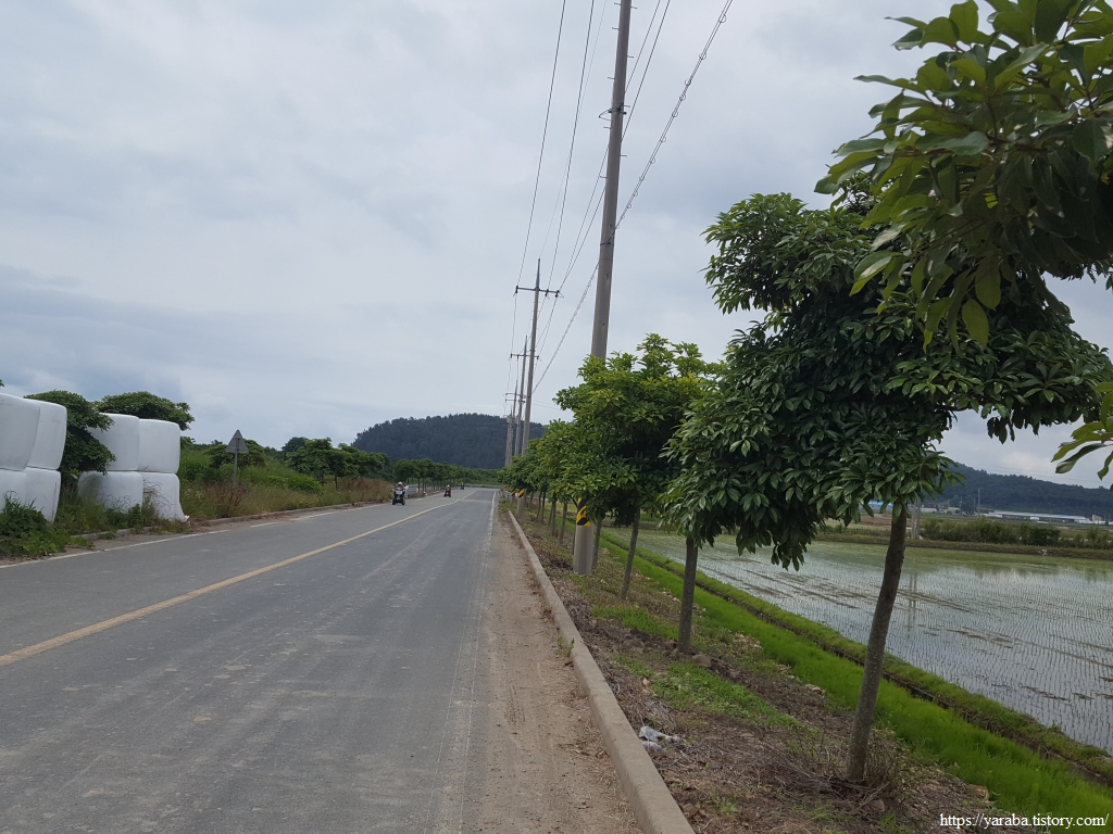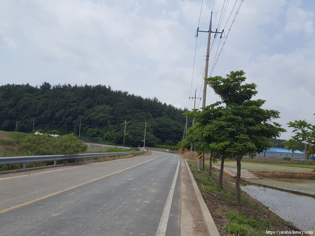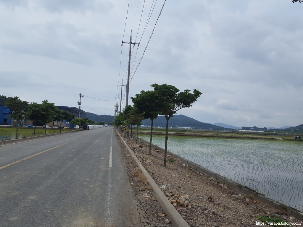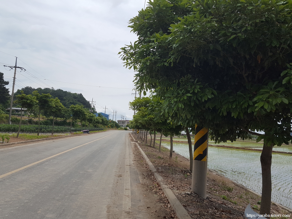 원래의 길은 교차로 가기 전에 우측 농로를 걸어야 하지만 우리는 그냥 정남진 해안로 도로를 따라 걷기로 했다. 우측으로 소산봉(243m)을 보면서 남쪽으로 걷는다. 좌측으로 가면 장환도인데 고려시대 여몽 연합군이 일본 정벌을 하기 위한 발진 기지로 사용했던 섬이라고 한다. 이곳 고마리 평야는 일제 강점기 간척으로 만들어진 땅이고 장환도로 연결하는 간척 사업은 1962년부터 3년간 진행되었다고 한다.