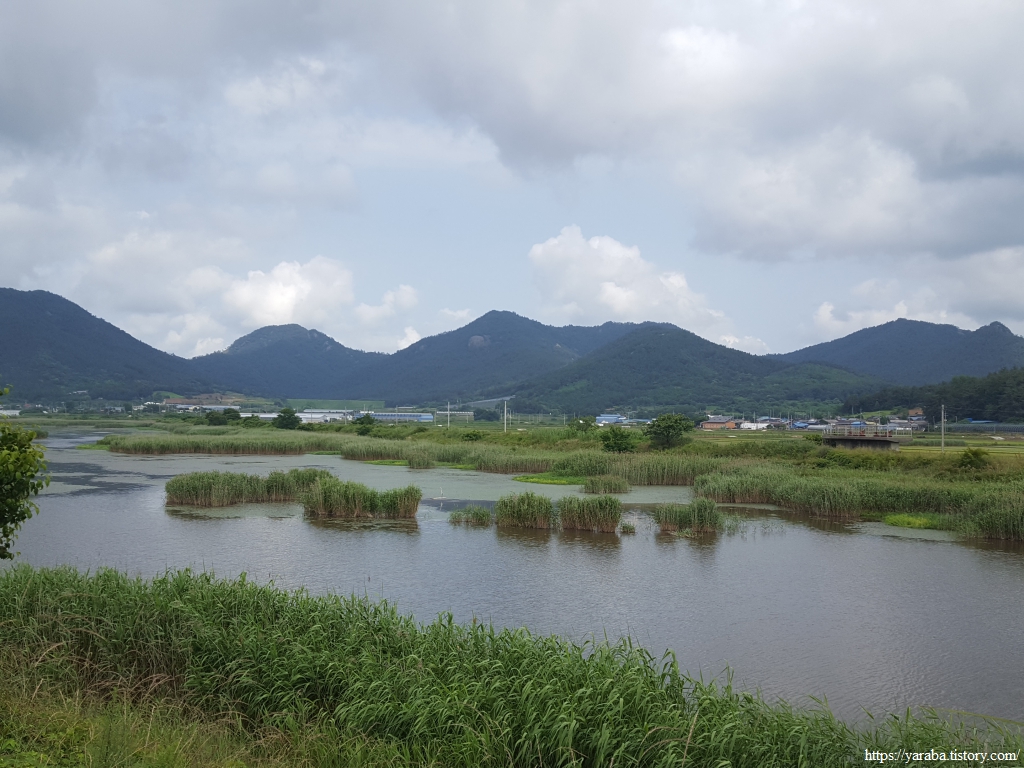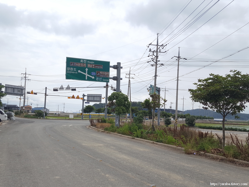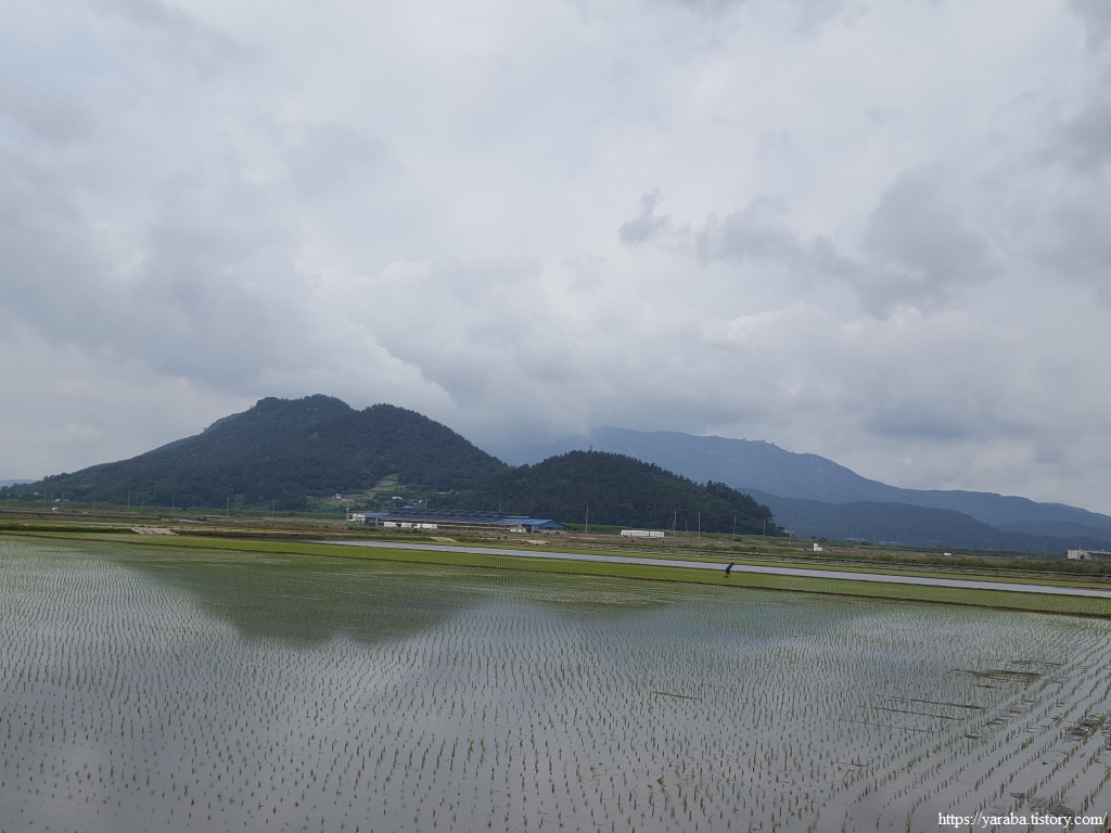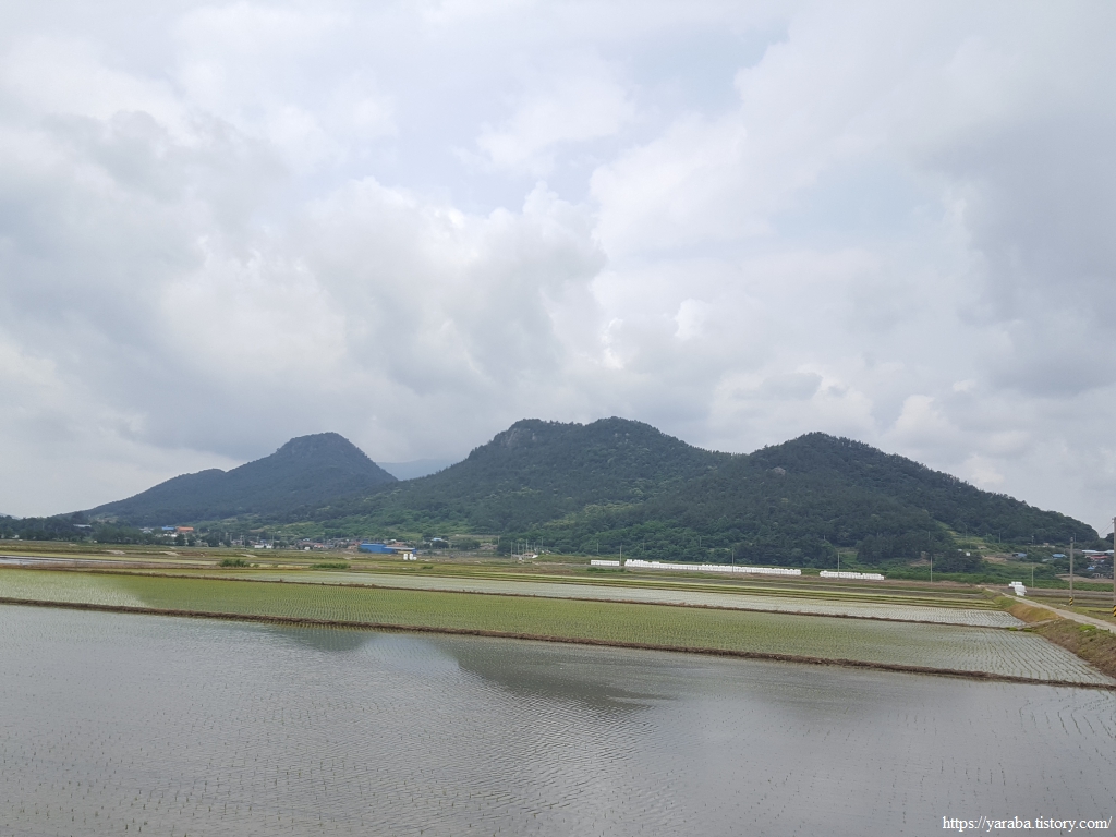 원래의 길은 교차로 가기 전에 우측 농로를 걸어야 하지만 우리는 그냥 정남진 해안로 도로를 따라 걷기로 했다. 우측으로 소산봉(243m)을 보면서 남쪽으로 걷는다. 좌측으로 가면 장환도인데 고려시대 여몽 연합군이 일본 정벌을 하기 위한 발진 기지로 사용했던 섬이라고 한다. 이곳 고마리 평야는 일제 강점기 간척으로 만들어진 땅이고 장환도로 연결하는 간척 사업은 1962년부터 3년간 진행되었다고 한다.