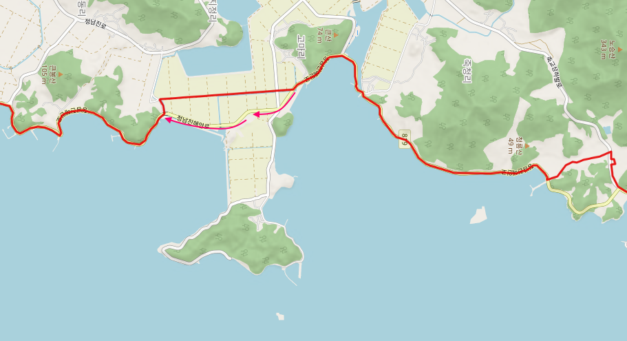 길은 농로를 걷던 원래의 남파랑길과 합류하여 해안길을 걸어간다. 넉넉한 갓길을 따라 신동리 해안을 걷는다.
