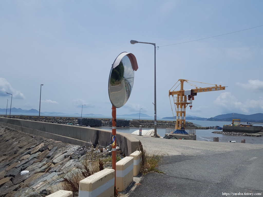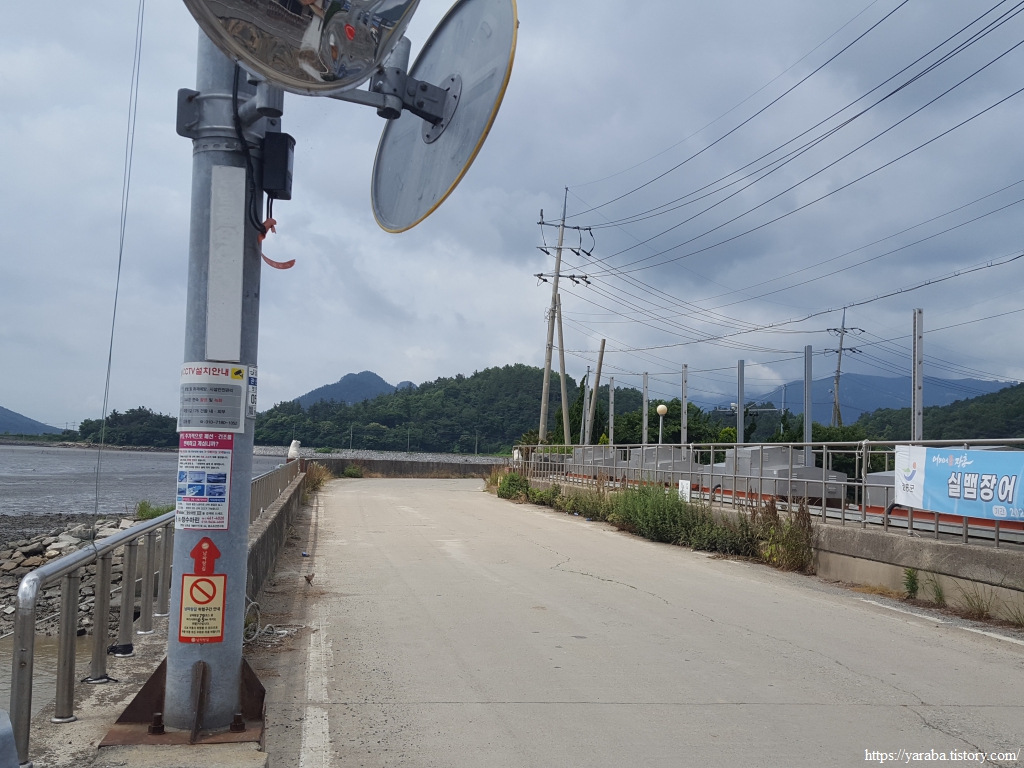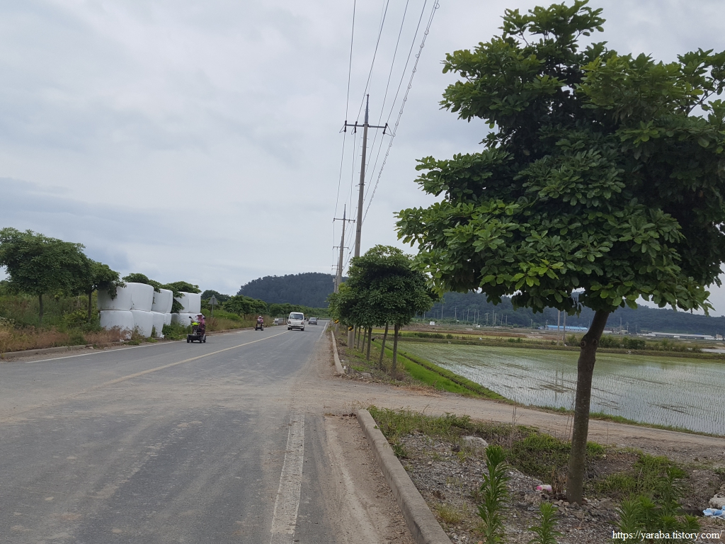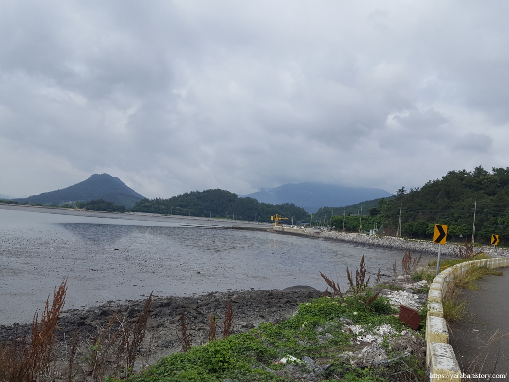 한참 길을 걷는데 할머니들의 전동 스쿠터 레이스가 펼쳐진다. 자동차도 피해 가야만 하는 위엄 있는 레이스다. 가끔 성질 급한 아주머니가 다른 분들을 제치고 앞서기도 하지만 일정한 간격, 일정한 속도로 집으로 가는 길이다. 아마도 갯벌일을 함께 하시고 돌아가시는 모양이었다. 어떤 지역은 갯벌에 구역을 나누기도 하지만, 구역을 나누지 않는 경우에는 공동 작업을 하는 방식이 불만을 잠재울 수 있는 방법이다. 좌측은 관산 제방이다.