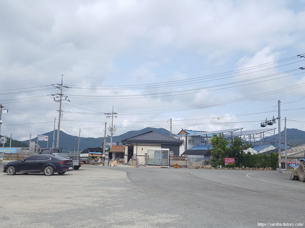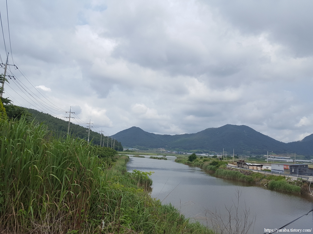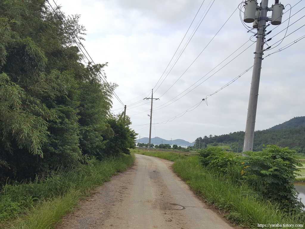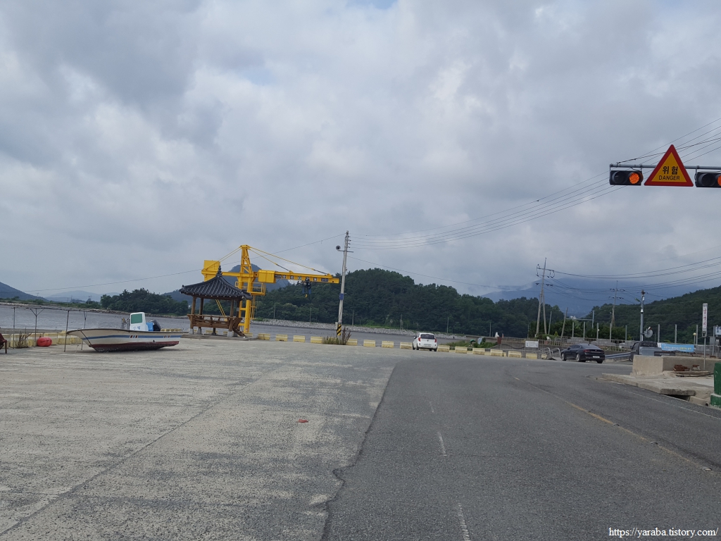 한참 길을 걷는데 할머니들의 전동 스쿠터 레이스가 펼쳐진다. 자동차도 피해 가야만 하는 위엄 있는 레이스다. 가끔 성질 급한 아주머니가 다른 분들을 제치고 앞서기도 하지만 일정한 간격, 일정한 속도로 집으로 가는 길이다. 아마도 갯벌일을 함께 하시고 돌아가시는 모양이었다. 어떤 지역은 갯벌에 구역을 나누기도 하지만, 구역을 나누지 않는 경우에는 공동 작업을 하는 방식이 불만을 잠재울 수 있는 방법이다. 좌측은 관산 제방이다.