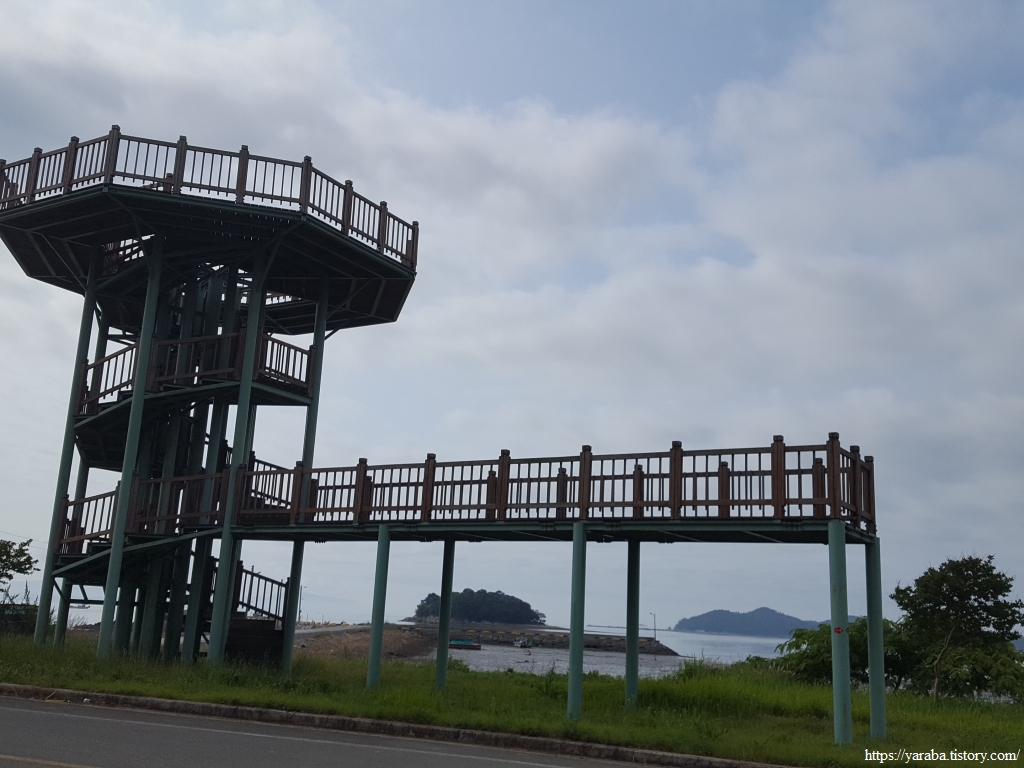 해변으로 나오면 상발 마을 포구와 함께 전망대를 만날 수 있다. 포구 너머로 상발 마을에 속한 자라섬을 볼 수 있다. 우회전하여 정남진 해안로를 걷는다.
