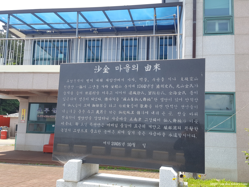 어느덧 길은 작은 산들에 둘러싸인 사금 마을에 도착했다. "살기 좋은 사금 마을이여 영원할 지어다!" 거창한 마을 유래에 미소가 번진다. 마을을 둘러싸고 있는 이곳을 안적산 분지라 표현하고 있다. 마을 앞의 1.5Km에 달하는 금빛 모래 해변이 있어 사금 마을이라는 이름이 붙었다고 한다. 지금의 모래 해변은 조금은 초라한 편이다.