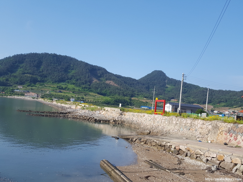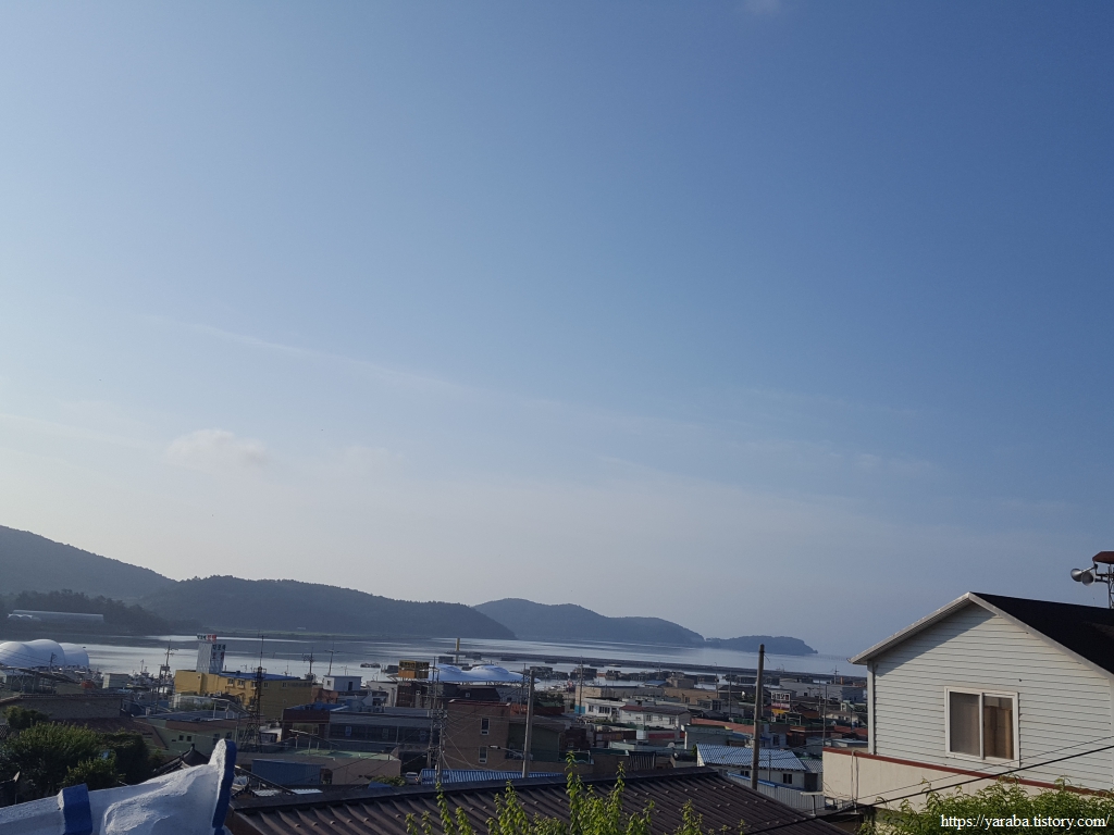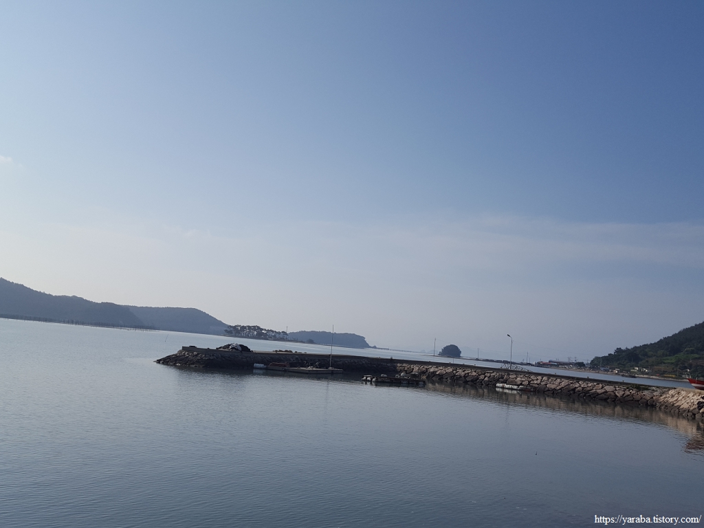 우측의 작은 섬은 탱자섬이라 불리는 섬이고 좌측으로 길게 보이는 섬은 노력도이다. 섬들이 천연 방파제 역할을 하고 있어 아침의 고요한 호수와 같다.