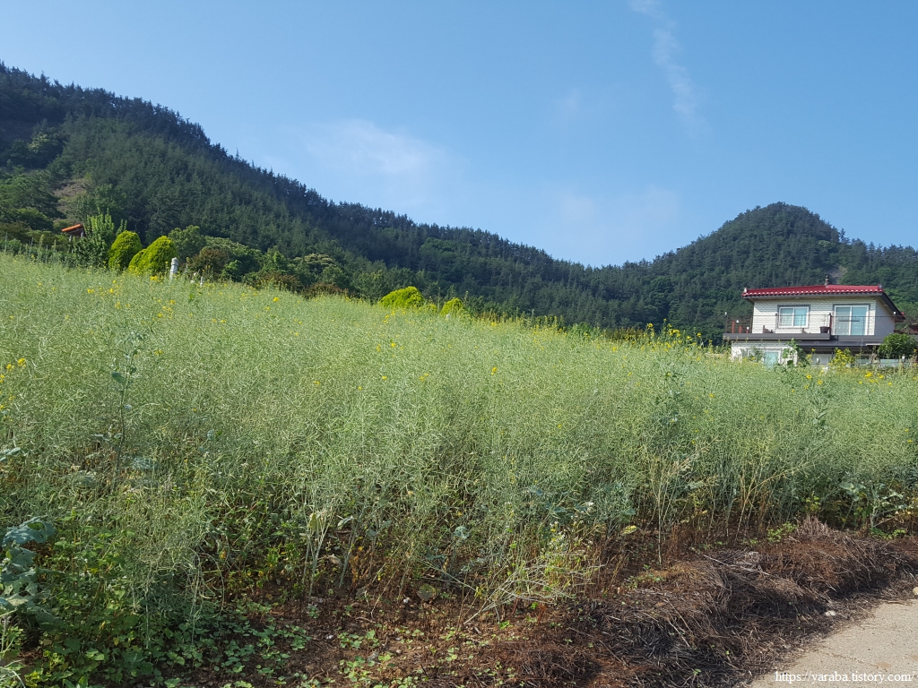 남파랑길은 선학동 유채 마을을 지나 가는데 봄에 노란 꽃으로 상춘객들을 맞았던 유채꽃은 지고 이제는 꼬투리에 열매가 익어가고 있다. 열매가 익으면 유채유 또는 카놀라유라고도 부르는 채종유를 짤 수 있다. 2006년부터 이곳을 찾는 사람들을 위해 논과 밭에 유채와 메밀을 심고 있다고 한다. 가을 메밀, 봄 유채로 이모작 수확도 하고 관광 자원으로도 활용하는 지혜다.