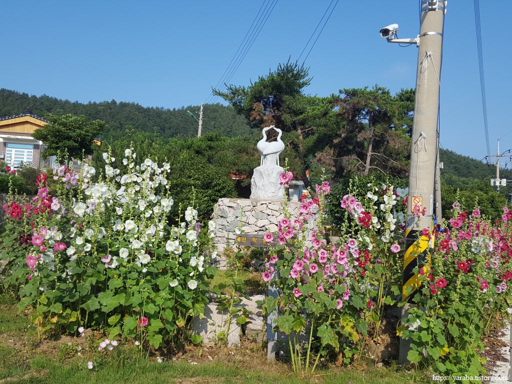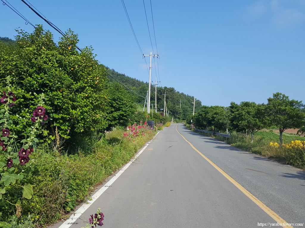 마을 앞 도로가에는 다양한 색상의 접시꽃들이 자리를 잡았다.