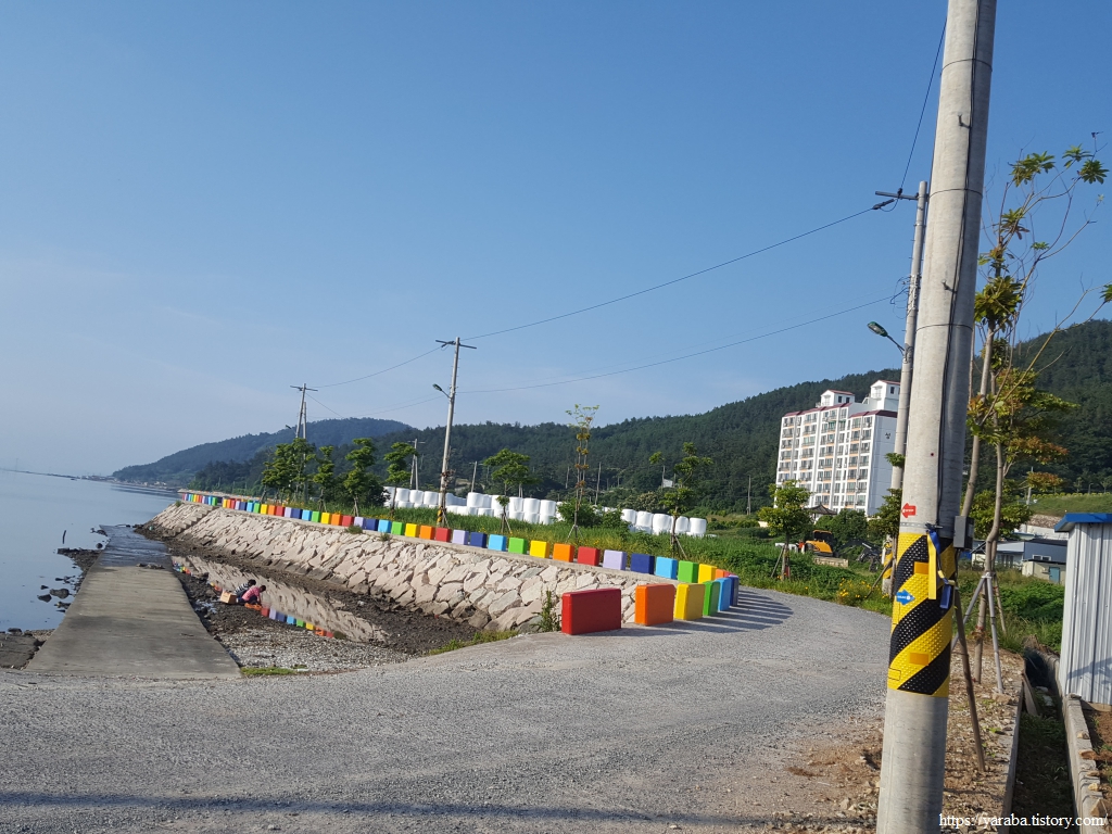 해안으로 나온 길은 회진항의 방파제 등대를 뒤로하고 해안 산책로를 걷는다. 빨주노초파남보 무지개 길이다.