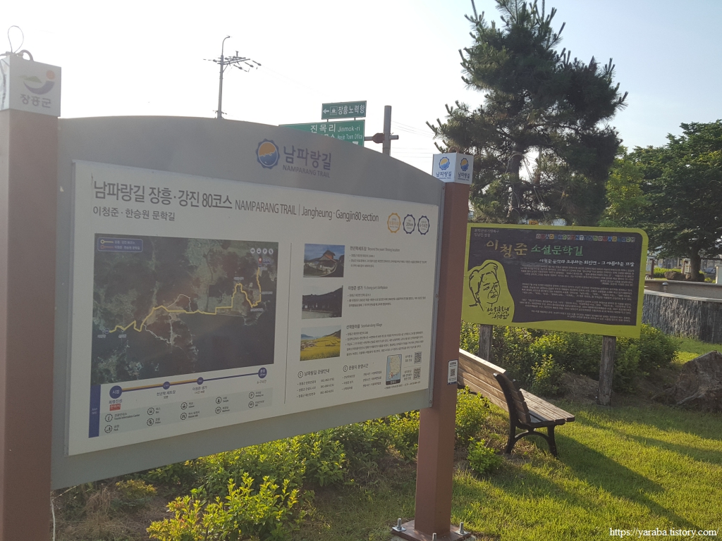 회진 터미널 앞에서 남파랑길 80코스를 시작한다. 안내판처럼 장흥, 강진 코스로 코스 후반에 강진으로 넘어간다. 이청준 소설 문학길과 함께한다. 스토리가 있는 길은 뭔가 남다르기는 하다. 소설 문학길을 걷는 가장 좋은 방법은 예습하듯, 길과 연관된 작가들의 소설을 미리 읽고 걷는 것이겠지만 아쉽게도 그렇게까지 정성을 쏟지는 못했다.