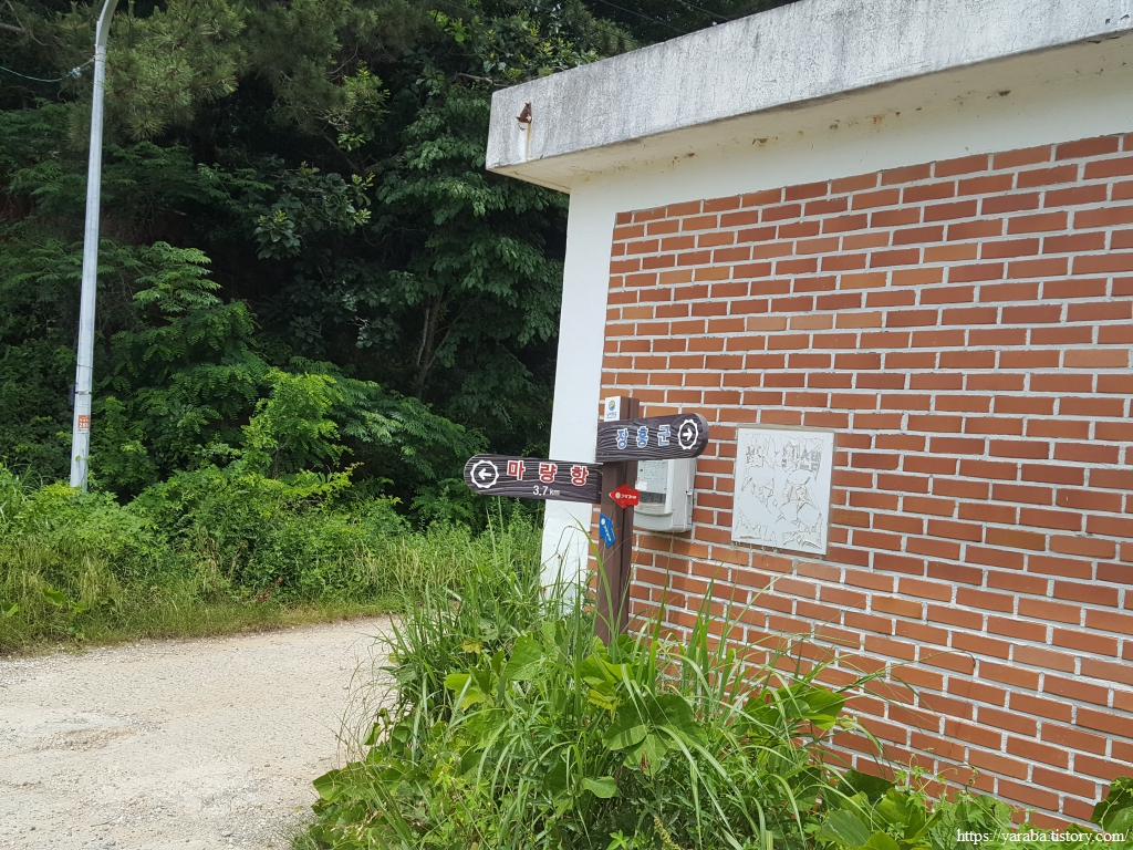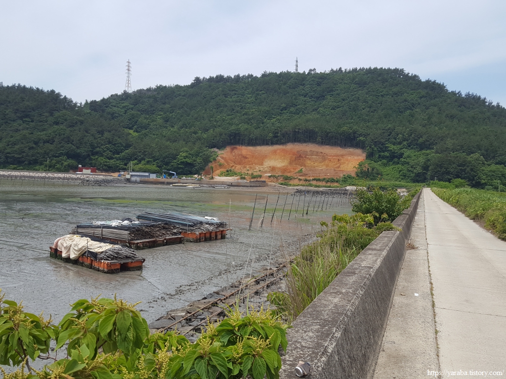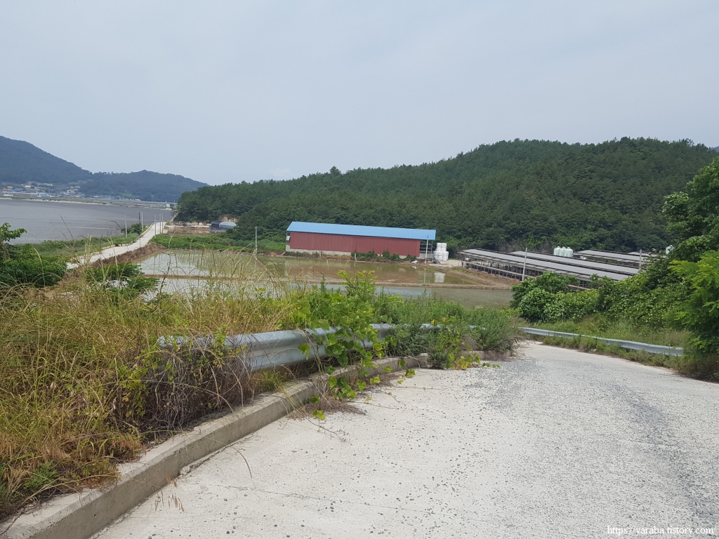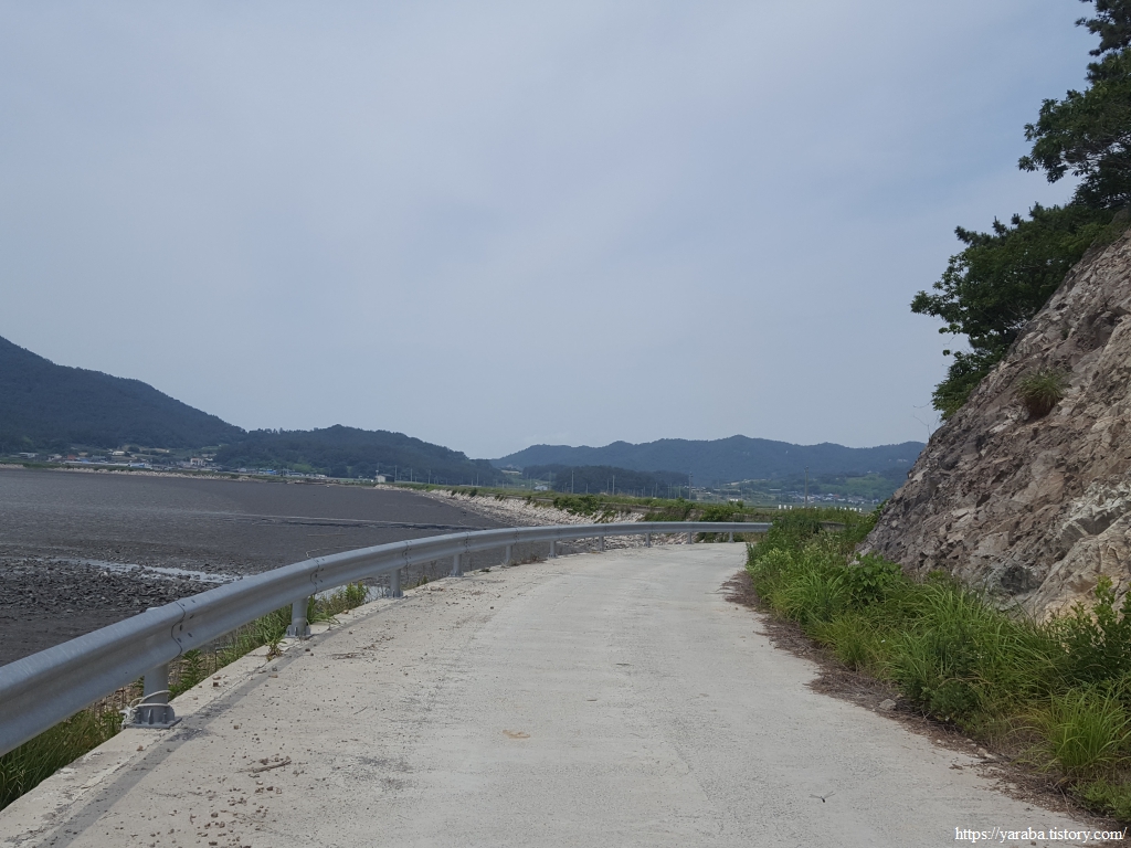 원래의 남파랑길은 오성금길 도로를 내려오다가 초입에서 우측 농로로 들어가 상흥천 둑방길을 따라 해안으로 내려가는데, 우리는 표식을 놓쳐서 그냥 도로를 따라 쭉 내려오다가 방조제를 건너 원래의 길과 합류했다.