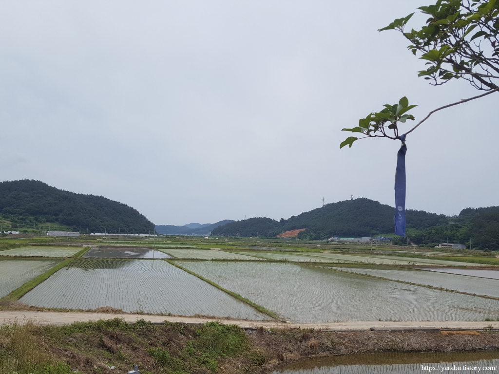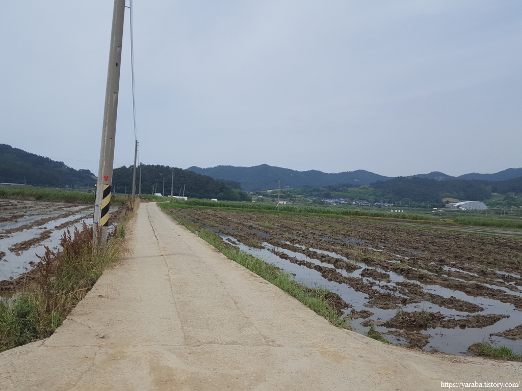 간척지 논을 서쪽으로 가로질러 간다. 이곳도 이모작 논인지 모내기가 한참 늦었다.