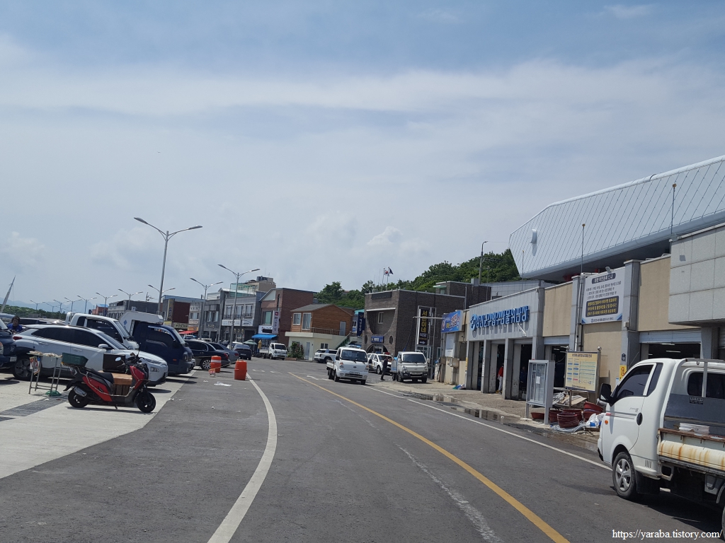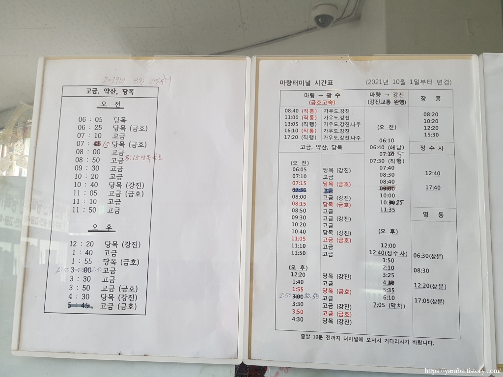 마량에서 중부 지방으로 가는 가장 좋은 방법은 광주로 가는 버스를 타는 것인데 마량은 인터넷 예약도 되지 않지만, 아저씨가 카드 결제도 해주지 않으셨다. 현금이 있어 다행이었다. 문제는 시간 간격인데 다음 버스까지 시간이 많이 남아서 배낭은 터미널 아저씨에게 맡기고 마량항에 있는 마량놀토수산시장에서 쉬다가 집으로 갔다. 평일이라 문을 연 상점은 없었지만 근처에 편의점이 있으니 편안하게 그늘에서 잘 쉬다 갔다.