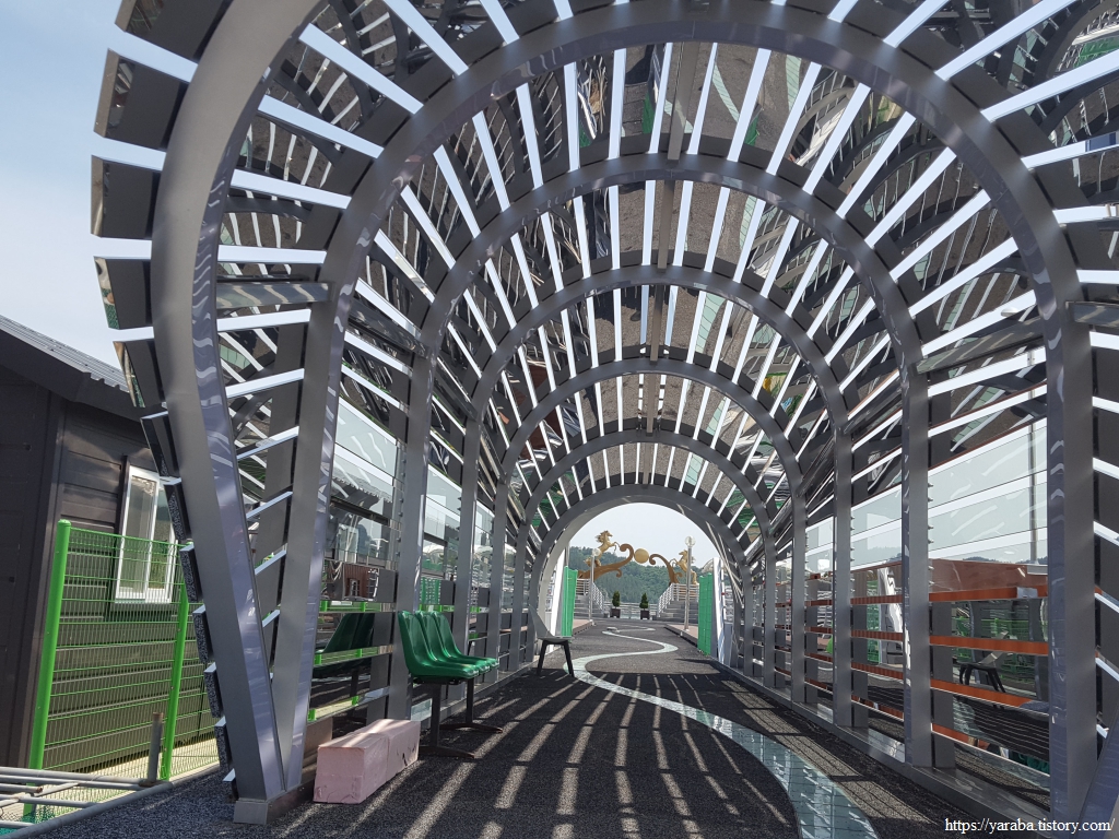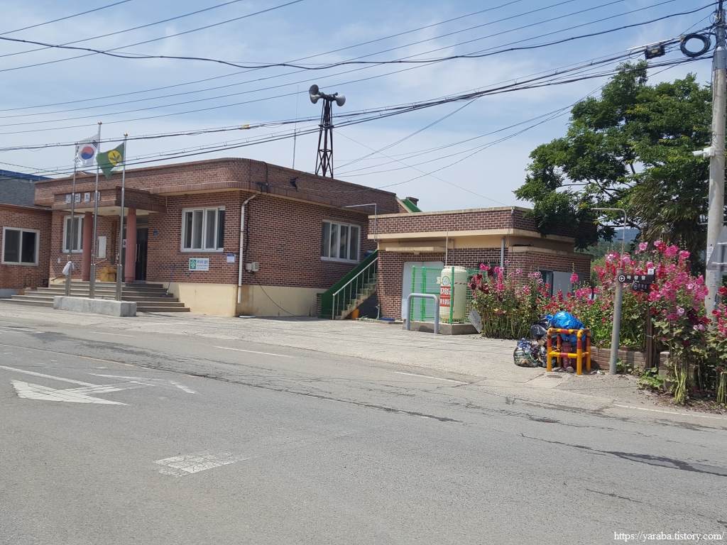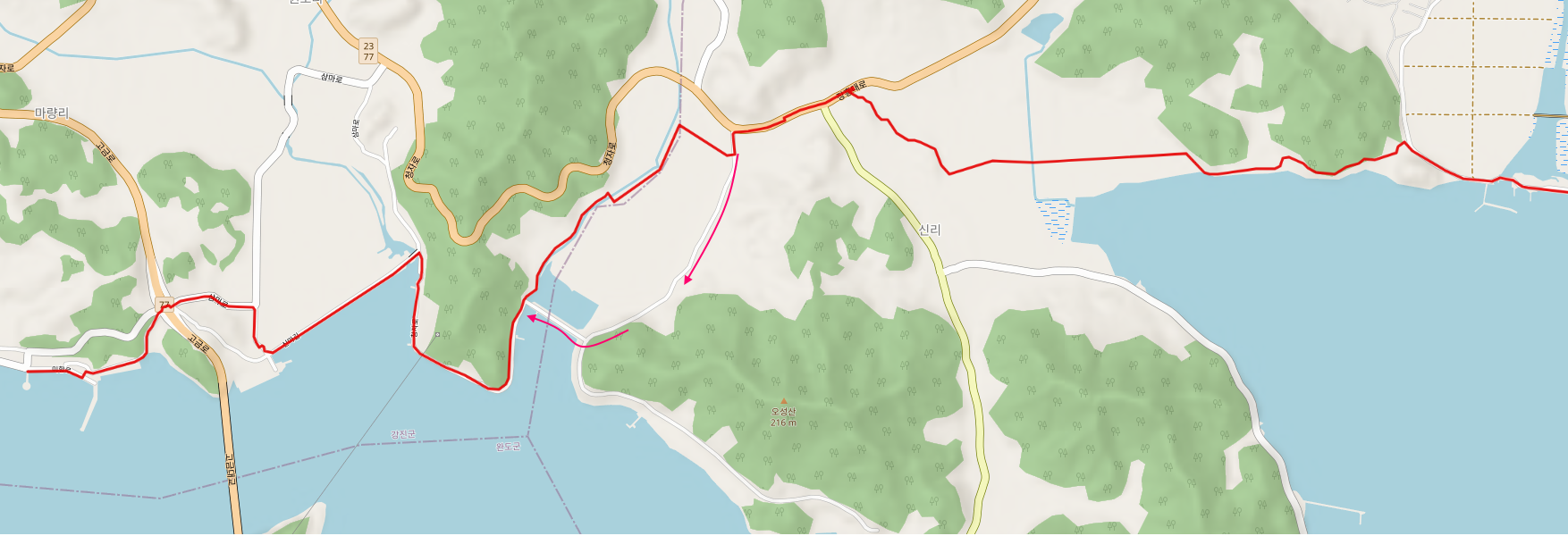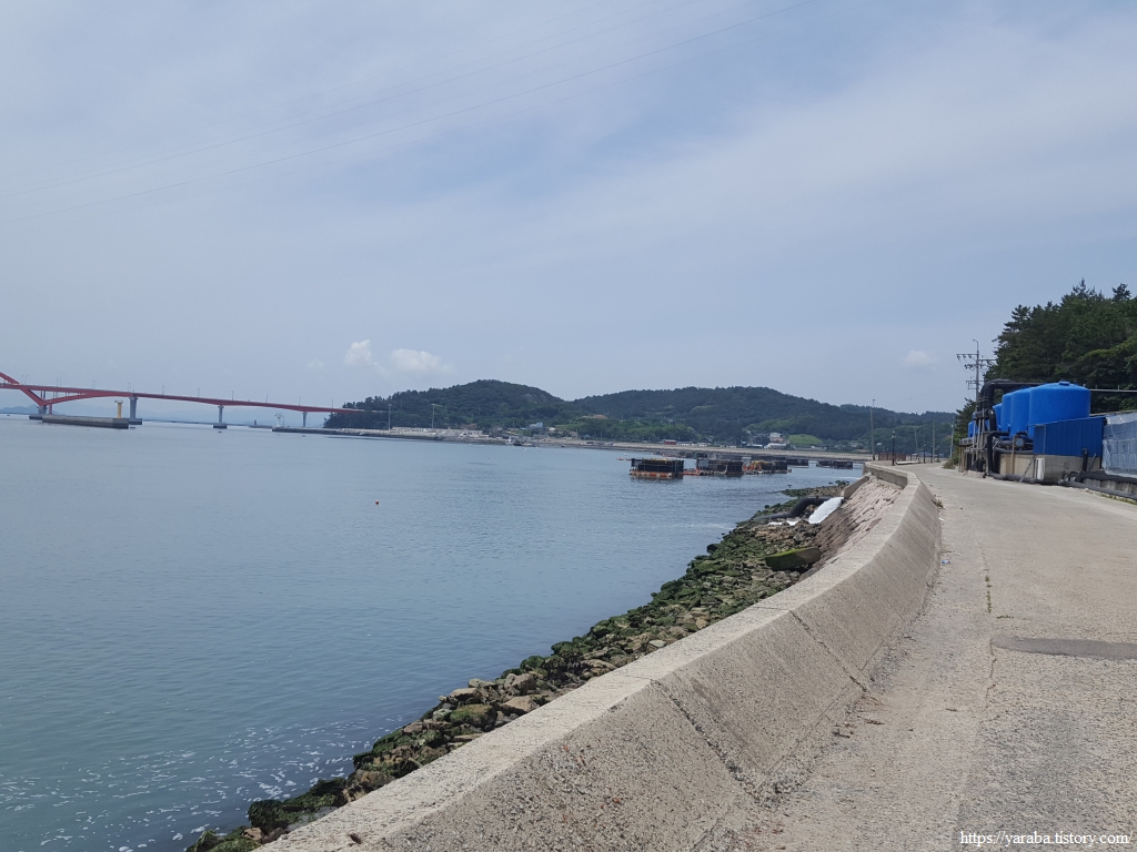 그늘 하나 없는 둑방길은 오후의 태양은 자비가 없다. 어르신 한분이 혼자서 남파랑길을 걷고 계셨는데, 어르신도 잘 걷는데 지쳐가는 우리의 모습에 부끄러운 마음이었다. 둑방길이 끝나면 전면에 강진항이 있지만 길이 없고, 우회전하여 신마 마을을 거쳐서 가야 한다. 원래는 신마항이었는데 시설을 보강하고 이름을 강진항으로 바꾸었다고 한다.