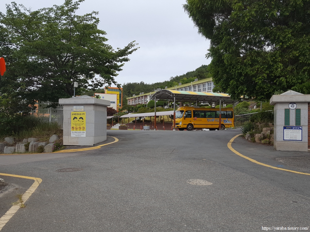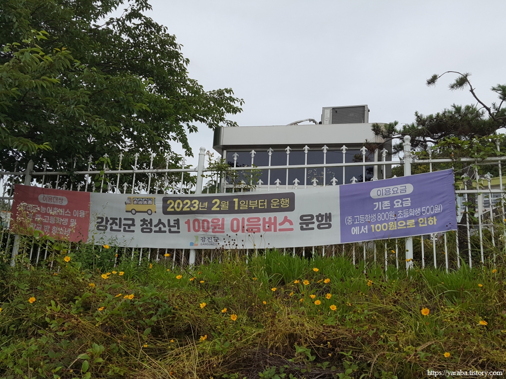 주말이라 아이들이 없는 마량초등학교 앞을 지나 까막섬로 도로로 나간다. 경남과 전남의 농어촌 군내버스를 운행하는 많은 지방자치단체가 천 원 버스라 해서 거리에 관계없이 천 원 한 장만 있으면 버스를 이용할 수 있는 곳이 많다. 남파랑길에서도 남해, 고흥 등에서 천 원 버스를 경험했었는데 강진도 천 원 버스를 운행하고 있다. 그런데 학교에 걸린 현수막을 보니 "백 원 이음버스"라 해서 청소년은 백 원만 내고 버스를 이용할 수 있도록 했다. 와우! 훌륭하다. 많은 군내버스가 텅텅 비어 다니는데 약간의 배려로 주민들이 즐거우면 얼마나 좋은가?