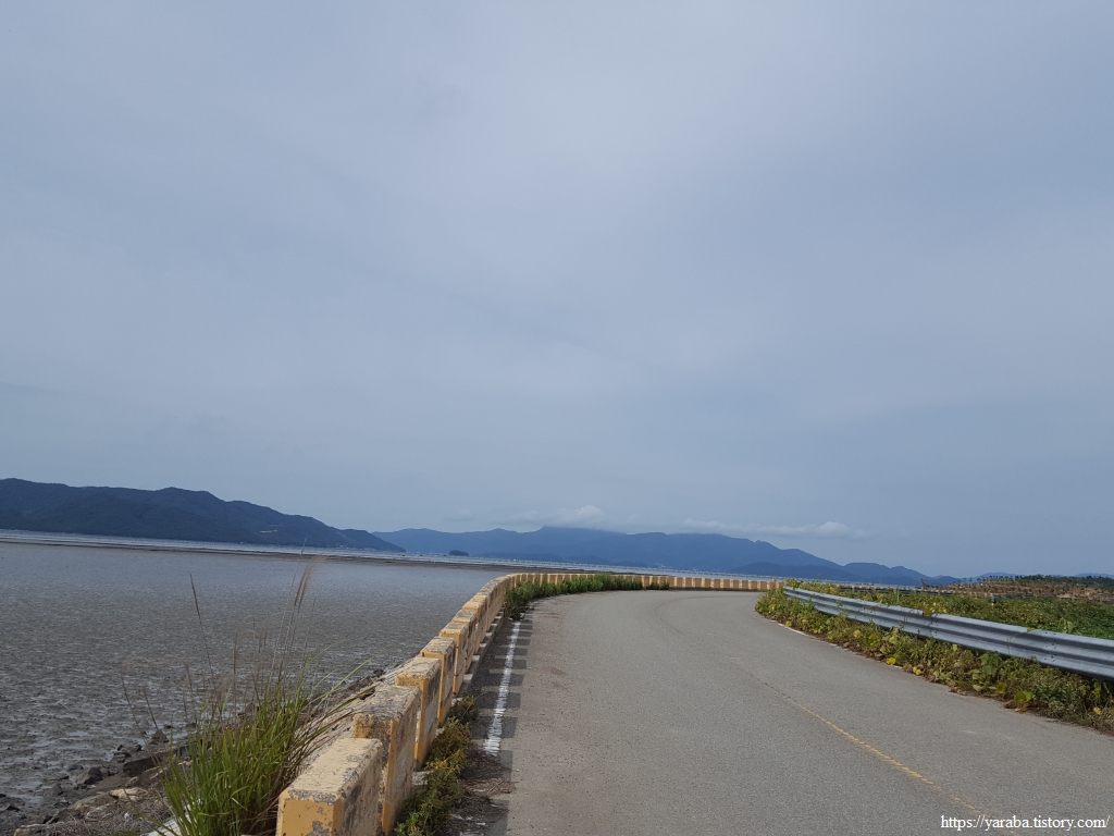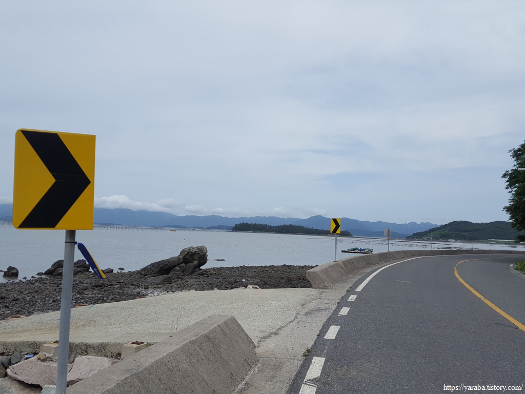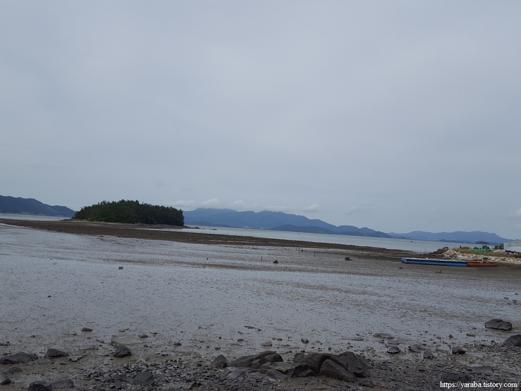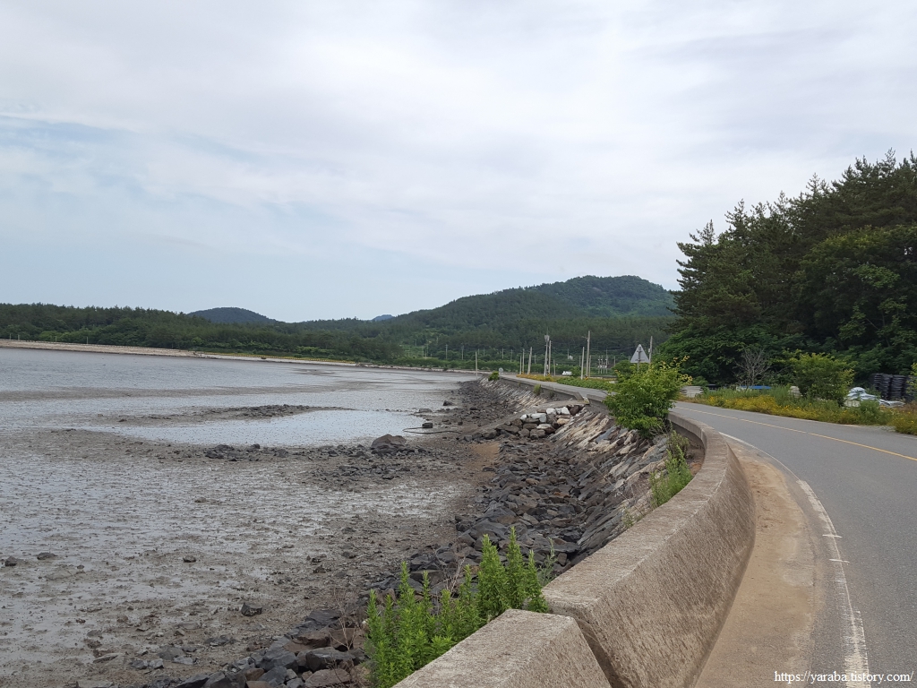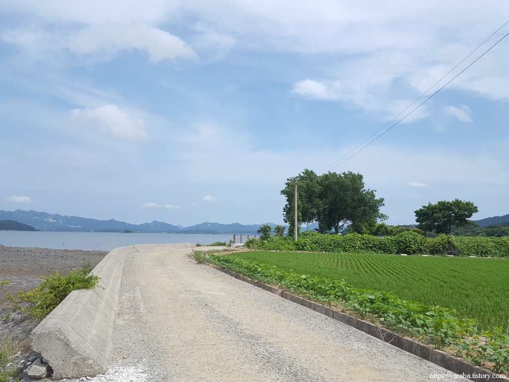 길을 지나는데 물 빠진 갯벌 너머로 내호도가 보인다. 갯일을 위한 갯벌길이 길게 내호도 방향으로 뻗어 있는데, 언뜻 보아서는 갯벌길이 섬과 연결된 것 아닌가 하는 생각도 든다. 혹시 길이 연결되어 있다면 어차피 길이 내호도 건너편까지 가야 하니 직선으로 가고 싶다는 유혹이 들었다. 그렇지만 안될 일이었다. 비슷한 경험을 순천 가는 길목에서도 한 적이 있어서 이번에는 빠르게 단념하고 길을 이어간다.