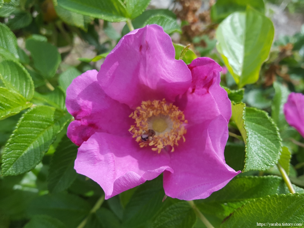 벌 한 마리가 해당화에 파묻혀 꿀을 따느라 정신이 없다. 해당화 꽃도 있지만 한쪽에서는 꽃이 떨어지고 벌써 열매가 익어가고 있다. 해당화는 볼 때마다 욕심이 나는 나무다.