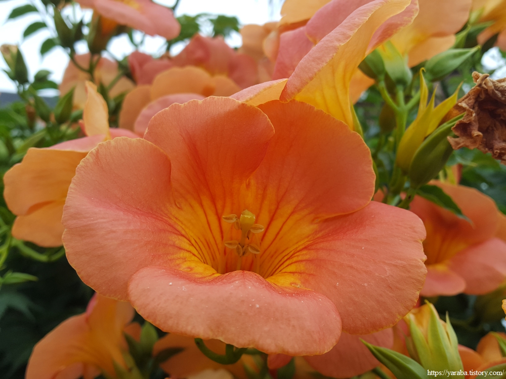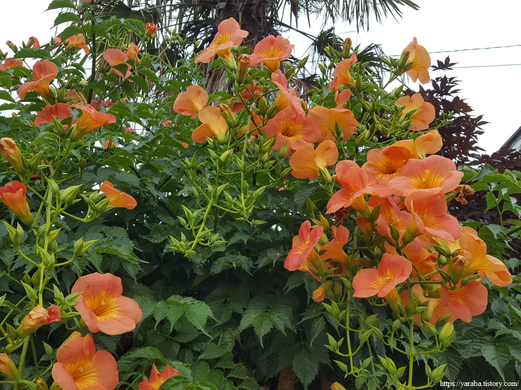 마을길에서 만난 능소화가 아침의 싱그러운 공기와 함께 여정의 시작에서 힘을 보태준다. 중국인 원산인 낙엽 덩굴나무이다. 능소화(凌霄花)라는 단어 의미를 보면 재미있는 것이 능가할 능, 하늘 소자를 써서 하늘을 능가하는 꽃이란 의미다. 추위에 약한 것이 흠이지만 잎, 줄기, 뿌리는 모두 부인병 약재로 쓰인다고 한다.