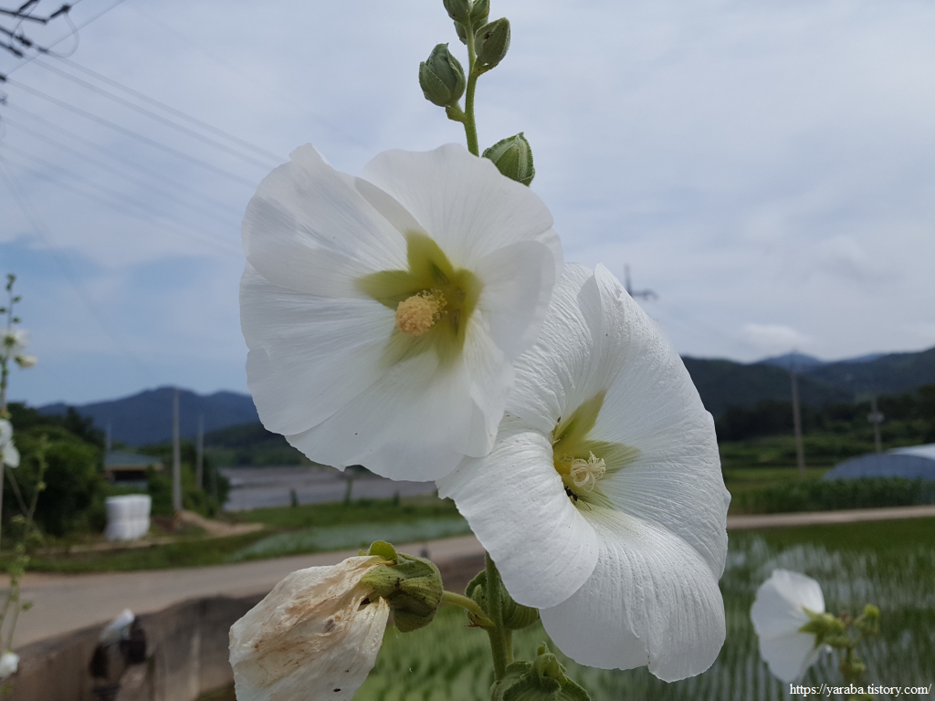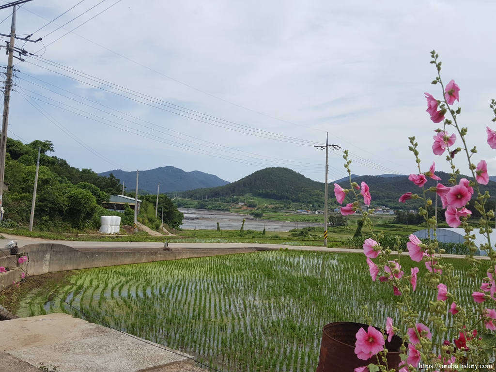남호 마을의 계단식 논들을 지나서 해변으로 내려간다. 맑은 날씨에 접시꽃의 자태가 더욱 아름답다.