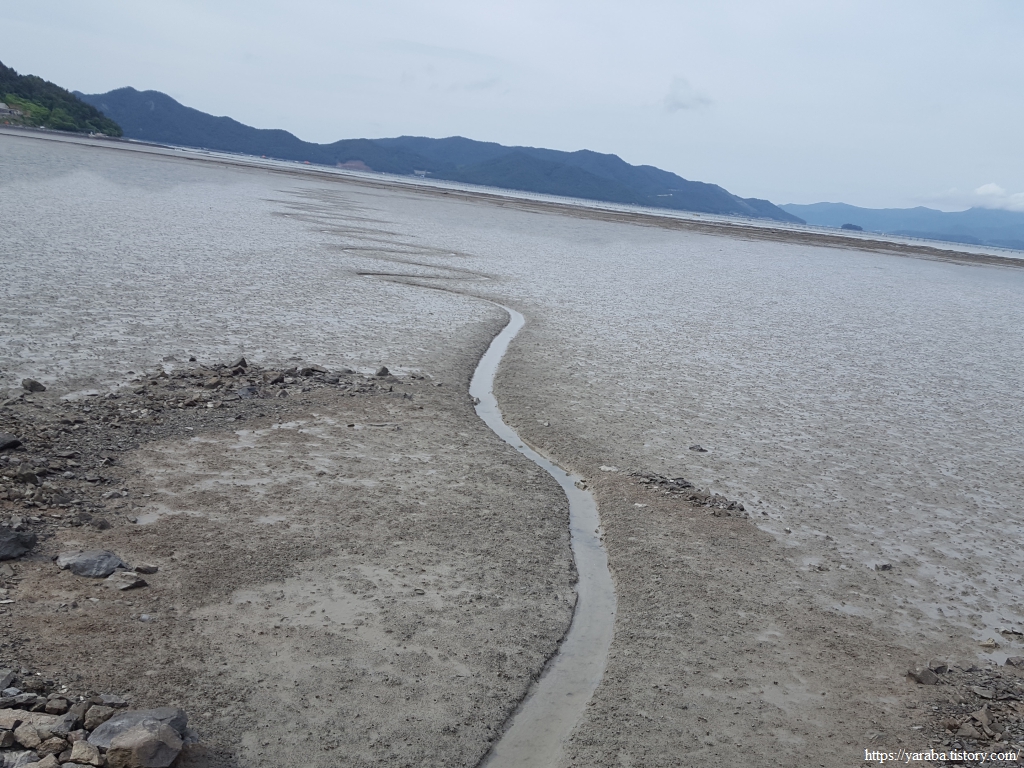 해안도로를 따라서 서쪽으로 이동하는 길 물 빠진 갯벌에 그려진 갯골이 작품이다. 바닷물이 빠졌을 때만 보이는 물길이 어떻게 저렇게 만들어졌을까 신기할 따름이다. 큰 강이 만들어내는 사행천도 아니고 밀물과 썰물이 반복되어도 그대로 남아 있는 작은 갯길에 감탄이 쏟아진다.