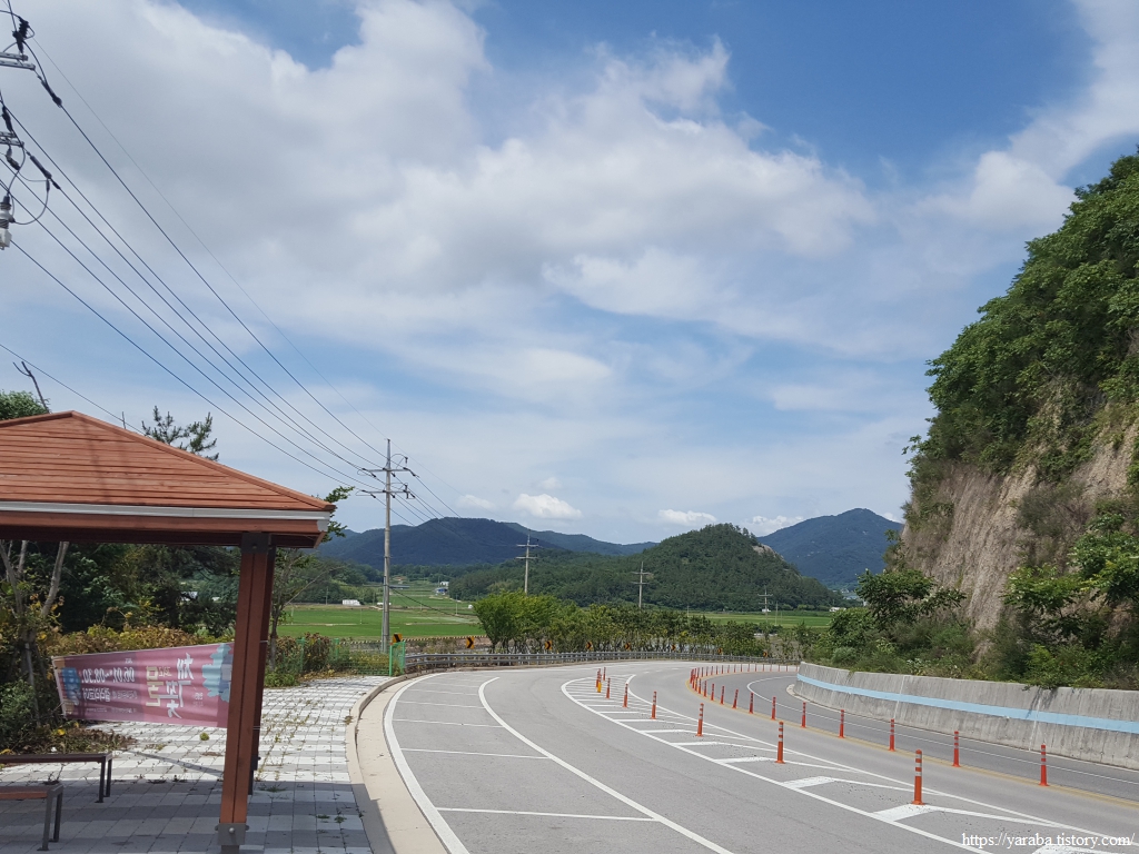 백산 아랫자락을 따라 올라온 길은 좌회전하여 봉황 마을로 들어간다. 남쪽으로는 푸른 평야 너머로 멀리 저두리에서 산을 넘어오는 국도도 보인다.