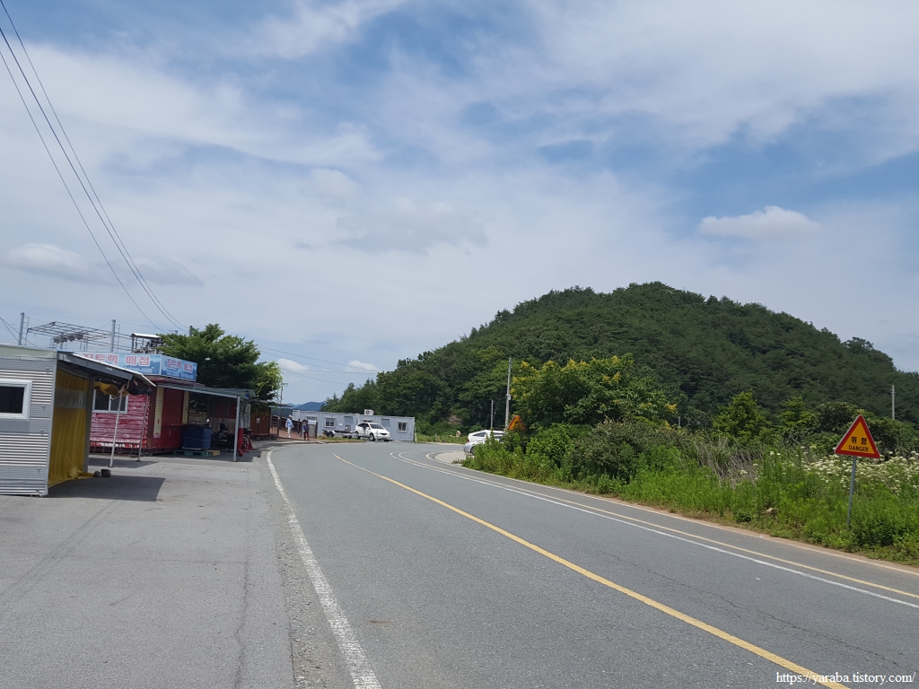 길은 전면으로 보이는 야산 방향으로 도로를 걷는다. 짚트랙 정류장 앞을 지난다.
