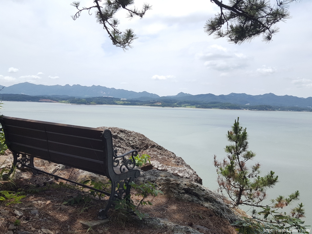 강진만 바다로 남쪽으로는 가우도, 북쪽으로는 칠량천 하구의 평야와 죽도를 보는 풍경이 펼쳐진다. 노을이 지는 석양이 만들어내는 풍경은 과연 어떨까? 하는 궁금증을 만들어 내는 풍경이다.