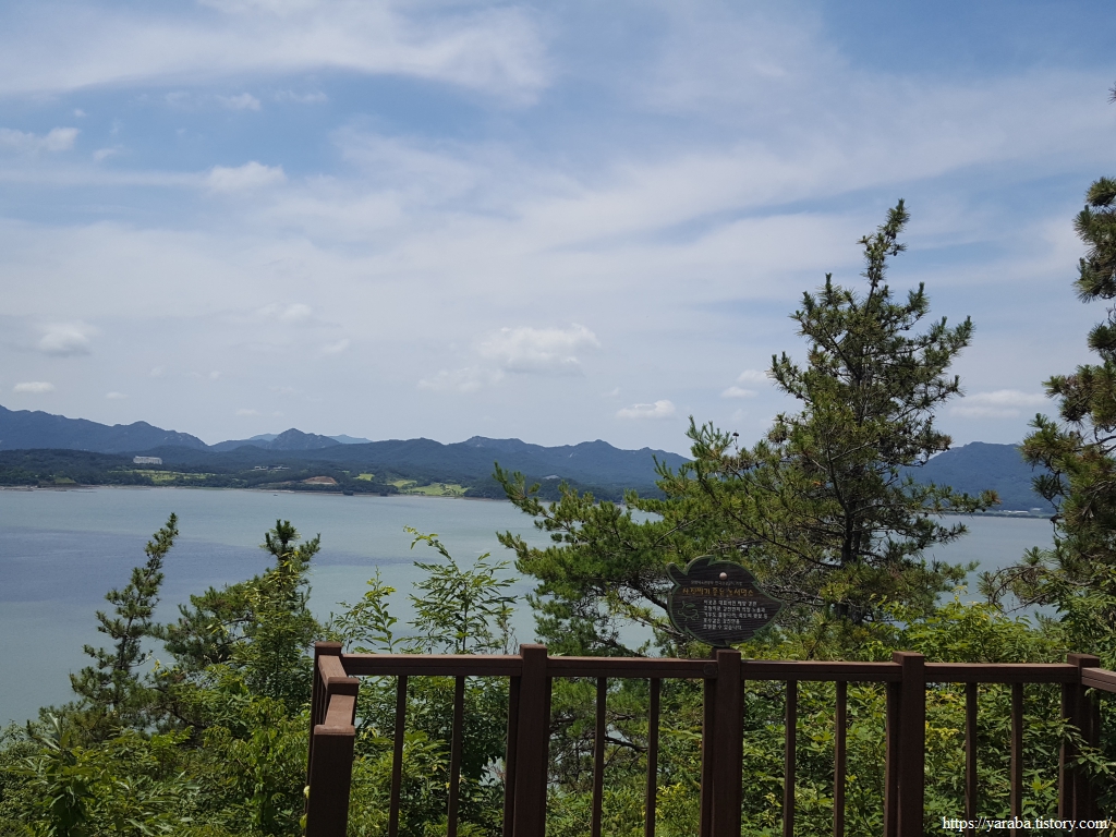 "사진 찍기 좋은 녹색 명소"라는 팻말이 붙은 전망대에서 강진만의 풍경을 잠시 감상한다. 남서쪽으로는 가우도의 청자타워와 출렁다리도 선명하게 보인다.
